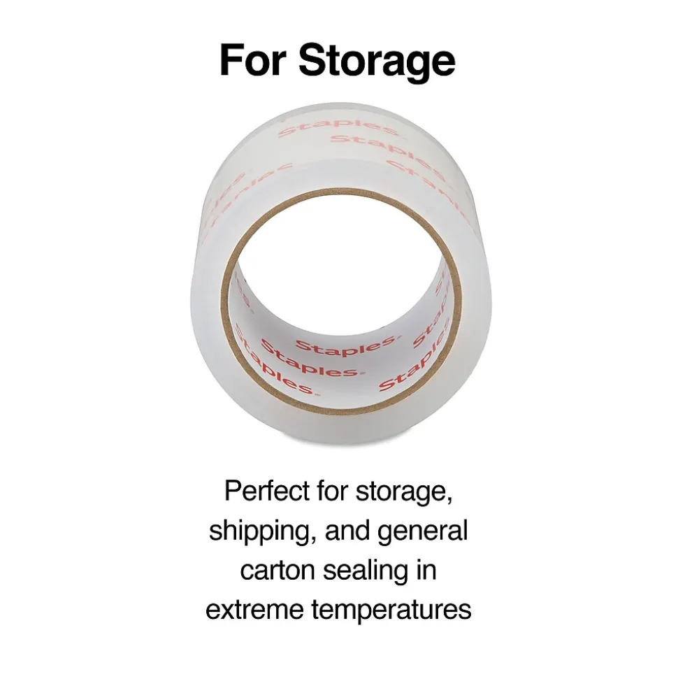 The StaplesĀ® lightweight moving and storage tape with dispenser is designed for easy one-handed operation to make box sealing quick and convenient.