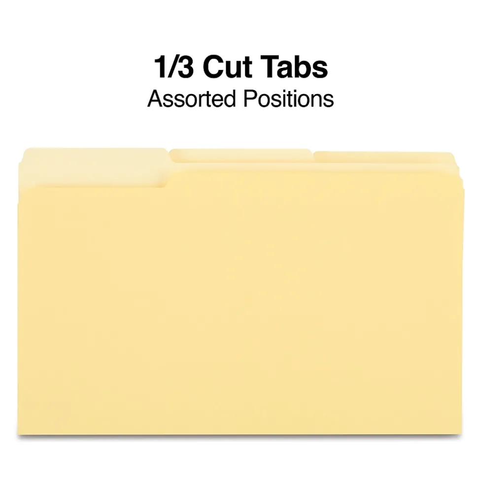 Gather office documents inside these file folders. The yellow hue lets you color-code paperwork for quick reference, and the 1/3-cut tab layout allows for custom labeling. The durable paper construction withstands frequent handling, making these folders conveniently reusable. With thoughtful sizing, these Staples legal-size yellow three-tab file folders accept legal-size pages to meet a range of paperwork storage needs.