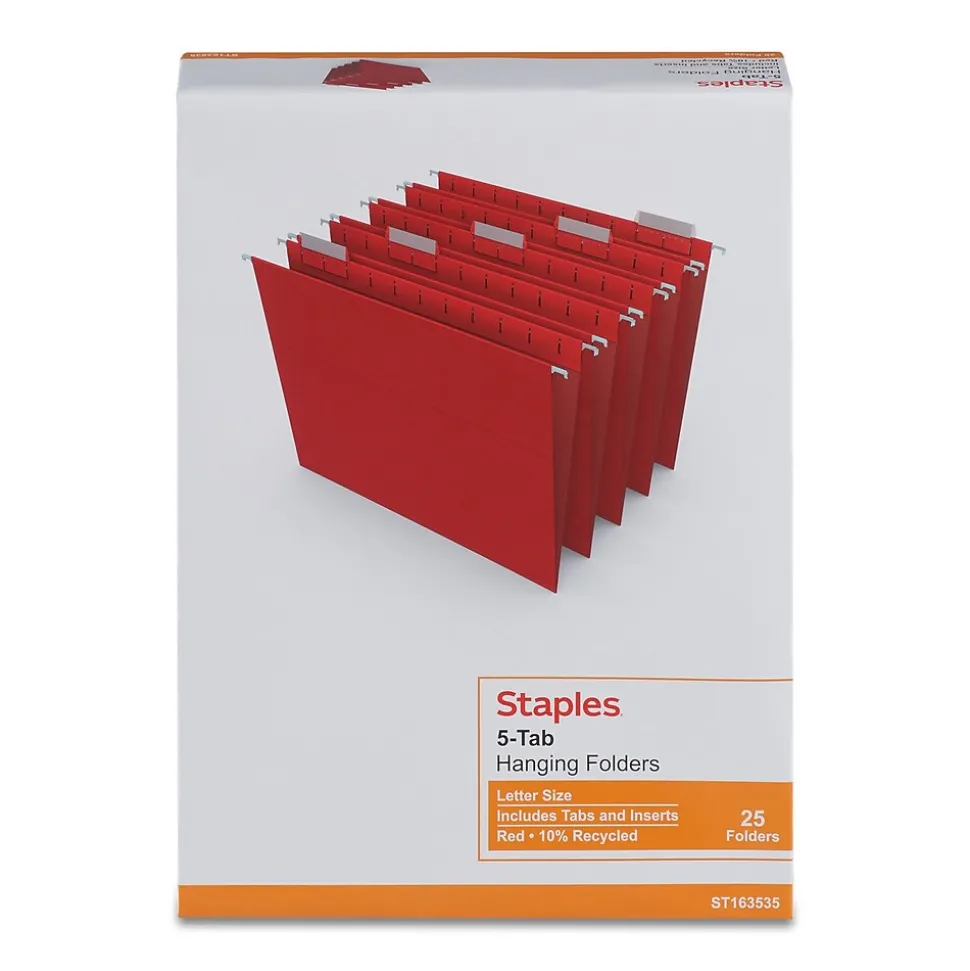 Color-code your most important paperwork with these red hanging file folders. Coated hooks and durable construction help extend the lifespan of documents, while the convenient sizing accepts standard pages for easy organization. A repositionable five-tab layout lets you categorize and label files to meet your business needs. These Staples letter-size red hanging file folders come in a 25-count box, providing an ample supply for ongoing projects or small-office use.