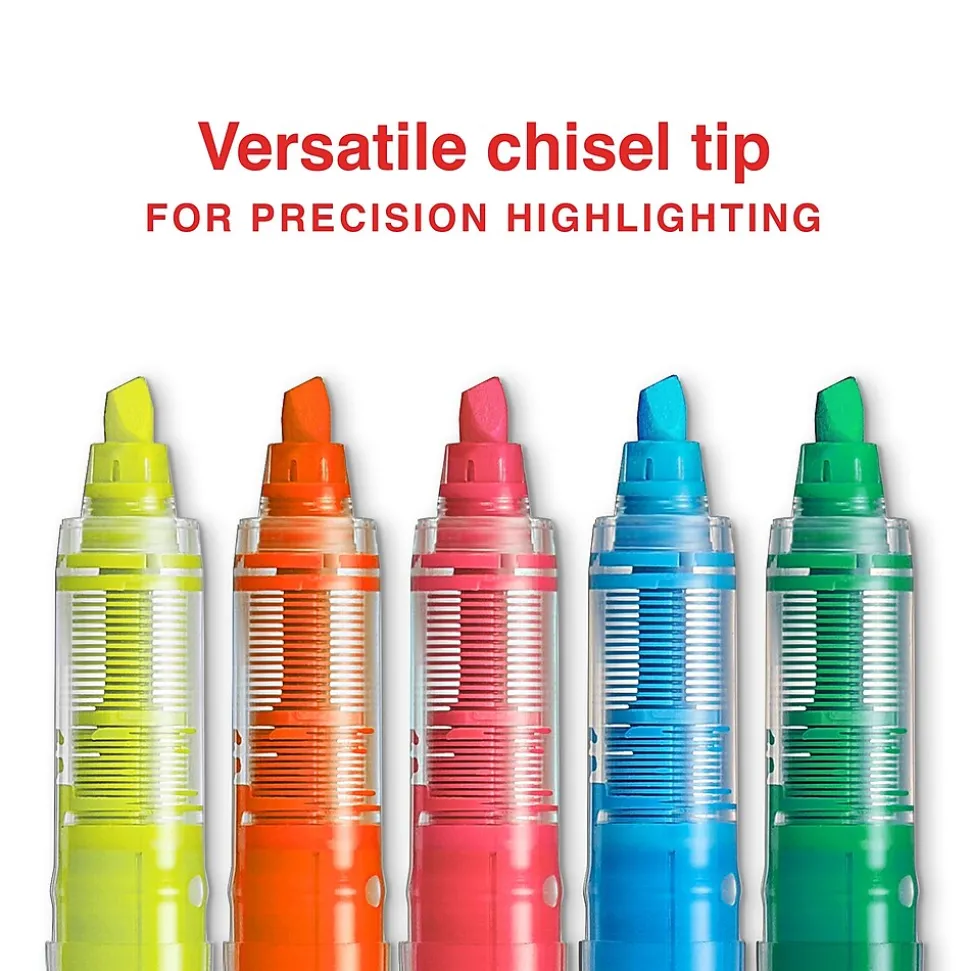 Call attention to facts, figures or notations with these liquid highlighters. Micro chisel tips let you create fine lines or bold strokes for flexible use options, while the bright colors stand out for better visibility. The quick-drying ink resists smudges and smears to leave paper neat. These Staples Hype! chisel-tip highlighters come in an array of bold hues, so you can create your own color-coding system.
