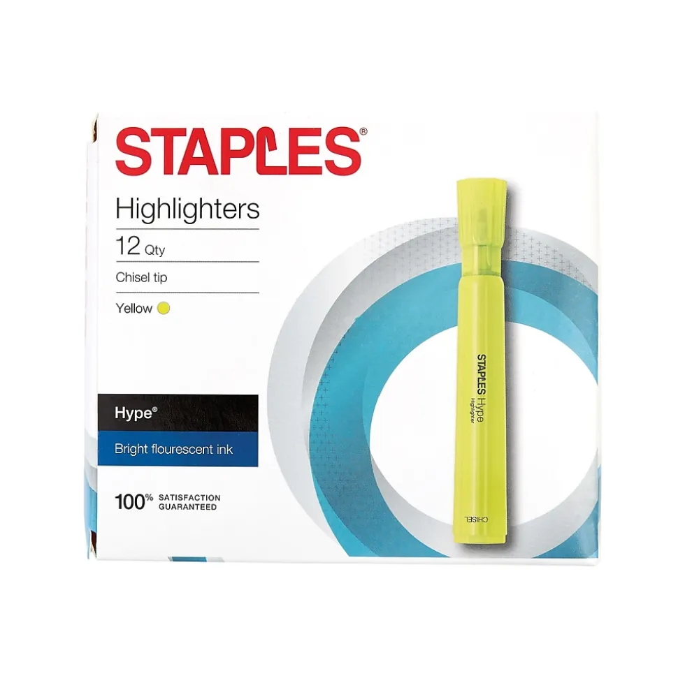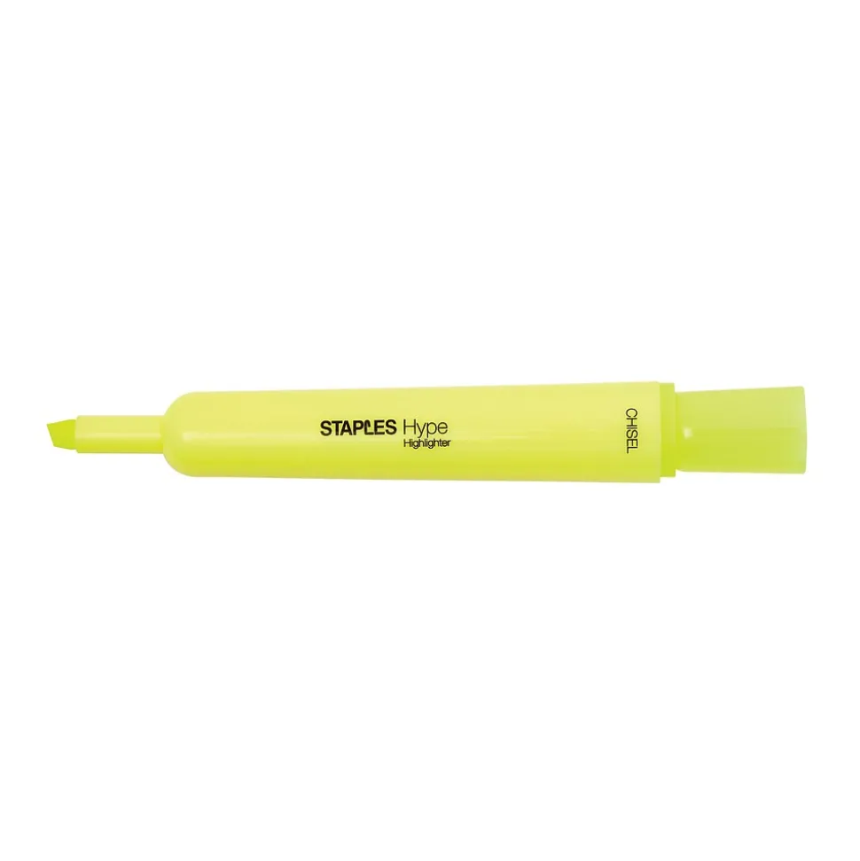 Make precise marks on faxes, photocopies, and other documents with these chisel tank highlighters. Each one has a long-lasting quick-drying ink supply and features a chisel tip, producing precise and detailed marks. These Staples Hype tank highlighters come in a pack of 12, are AP-certified nontoxic and are a transparent yellow color, letting you easily see text that you have highlighted over.
