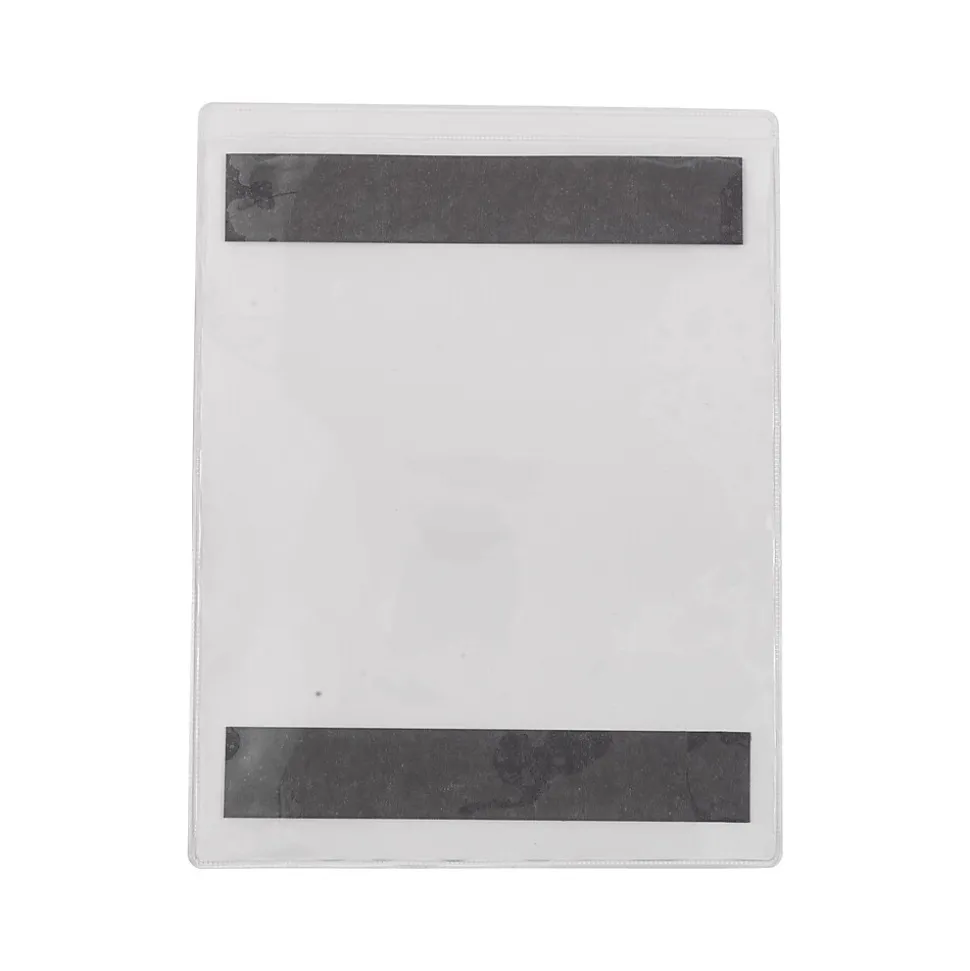 Preserve warnings, product orders, and other documents in work environments with this 15-count pack of job ticket holders. The thick, clear poly protects interior contents from moisture or dirt while text and images remain visible. Top-loading insertion with three enclosed sides lets you quickly add and remove paperwork or signage. Magnetic strips on these Staples job tickets enable secure placement on any metal surface.