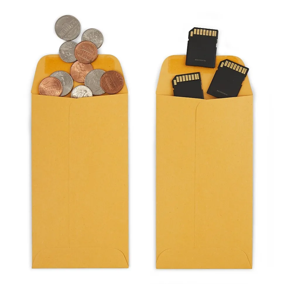 Keep small items organized and secure in these brown coin envelopes. The gummed closures prevent the contents from slipping out, while the small size is ideal for coins, jewelry and other similar products. Sturdy 24-pound kraft construction resists ripping and tearing for long-lasting durability. These Staples kraft coin envelopes come in a 500-count package, providing an ample supply to meet your business needs.