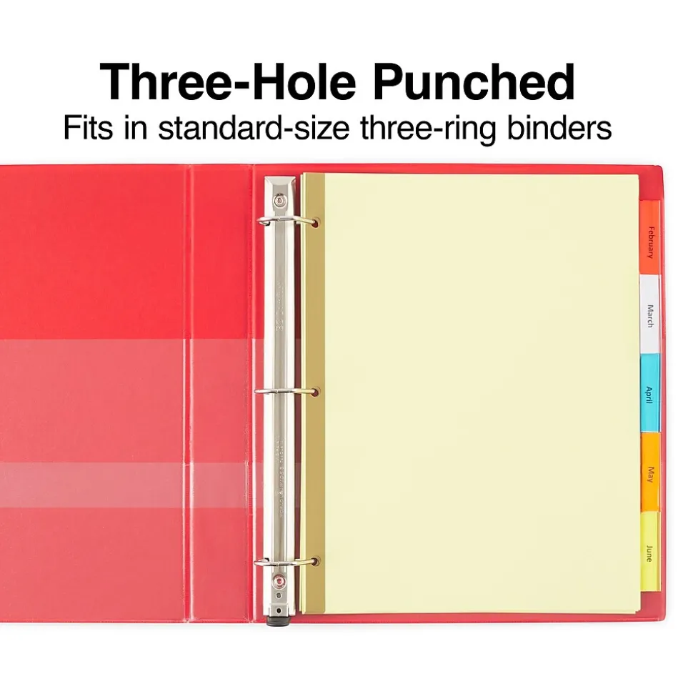 Find documents quickly with these Staples insertable Large Tab dividers. Double-sided reinforced binding edges prevent the three-punch holes from tearing, and the assorted-color tabs make it easy to categorize paperwork. The tabs feature a unique design that keeps labels securely inside for easy subject identification. These Staples insertable Large Tab dividers meets EPA guidelines with 20% recycled content.