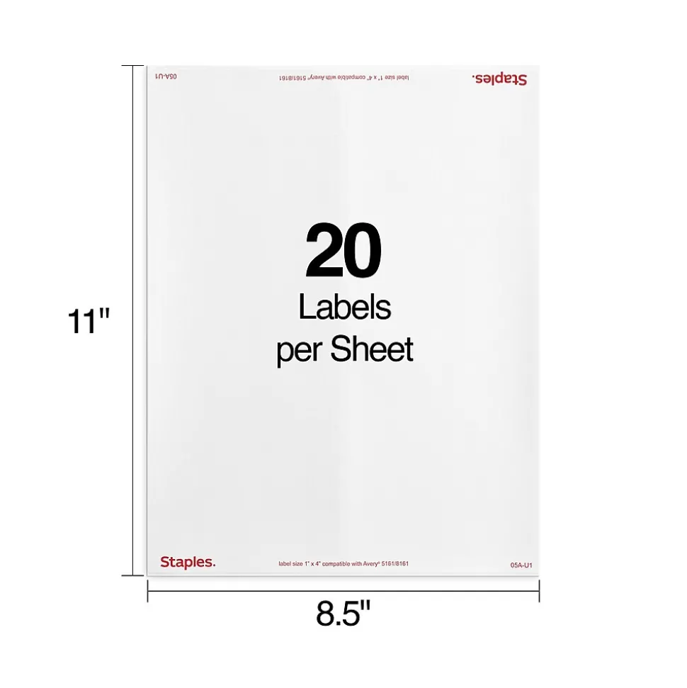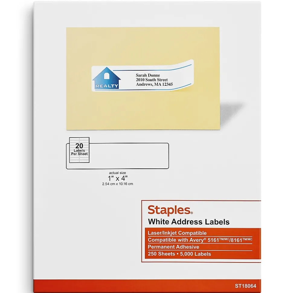 Keep addresses firmly attached to packages and envelopes with these Staples address labels. Create your own custom designs on software such as Microsoft Word, WordPerfect and Avery LabelPro, and then print them onto these labels with a laser or inkjet printer. These Staples address labels are matte white and come with 5,000 per box, so there’s enough to tackle even the largest shipping tasks.