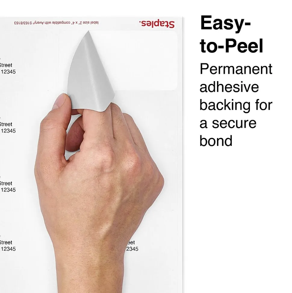 Ensure packages and envelopes are easy to read with these Staples shipping labels. These mailing stickers are coated with permanent adhesive and come in packs of 2,500, making them ideal for high-volume shipping tasks. Customize these Staples shipping labels via a word processing program, and print them with an inkjet or laser printer for a personalized, professional appearance.