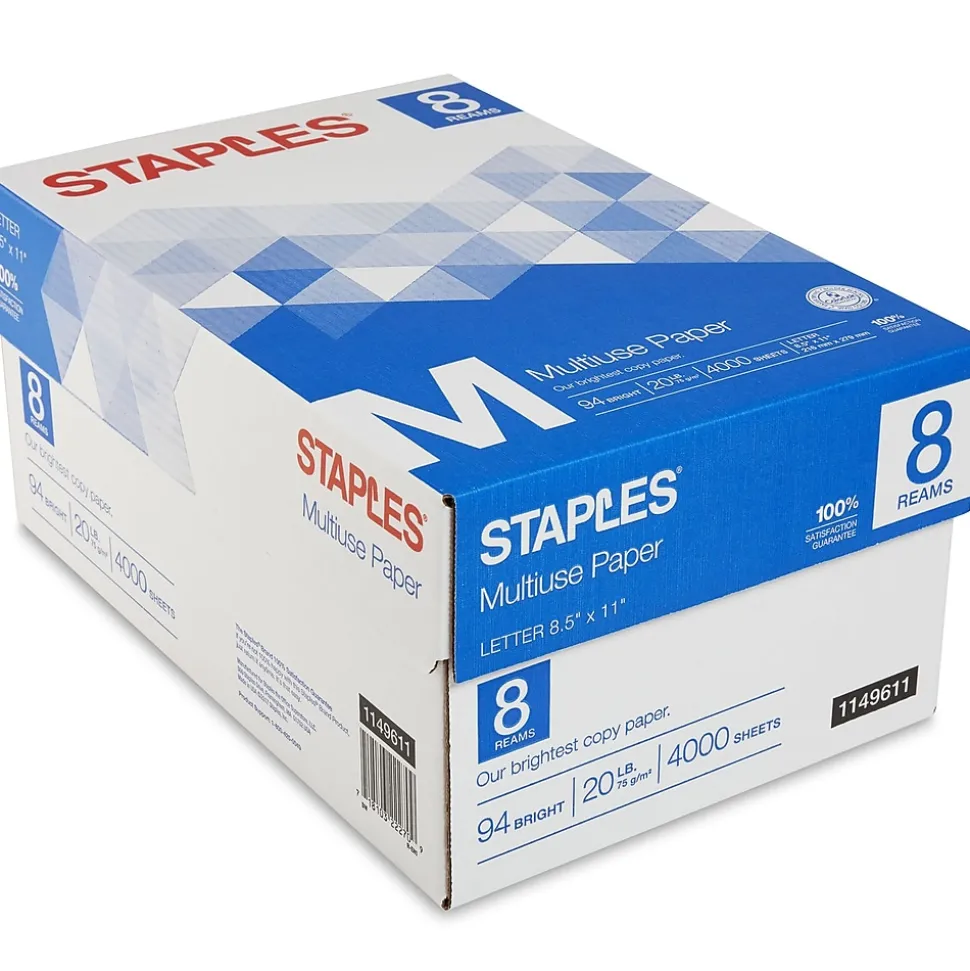 Produce multiple copies or stacks of documents with this eight-ream case of Staples multiuse copy paper. The acid-free construction keeps each sheet looking like new for longer, and the 20-pound paper weight is ideal for everyday printing tasks. Featuring ColorLok technology, this Staples multiuse copy paper brings out the best in monochrome or color prints to give your paperwork a professional look.