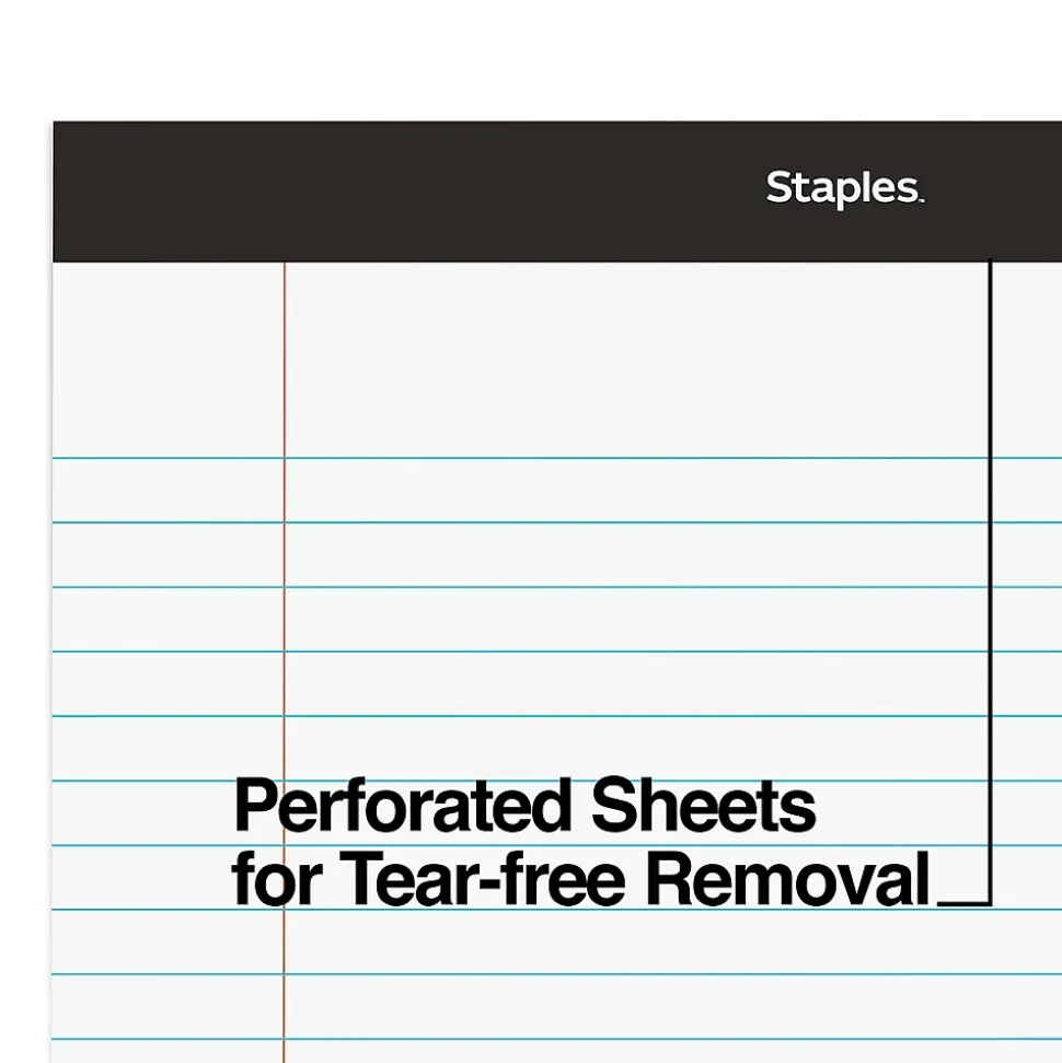 Meet your team’s everyday writing requirements with these 50-sheet ruled notepads. The white pages provide a clean background for your text and drawings, while the wide ruling helps keep your writing neat and easy to read. Convenient micro-perforations let you tear off a page cleanly. These Staples 8.5 x 11.75-inch white wide ruled notepads have a top binding to keep pages secure.