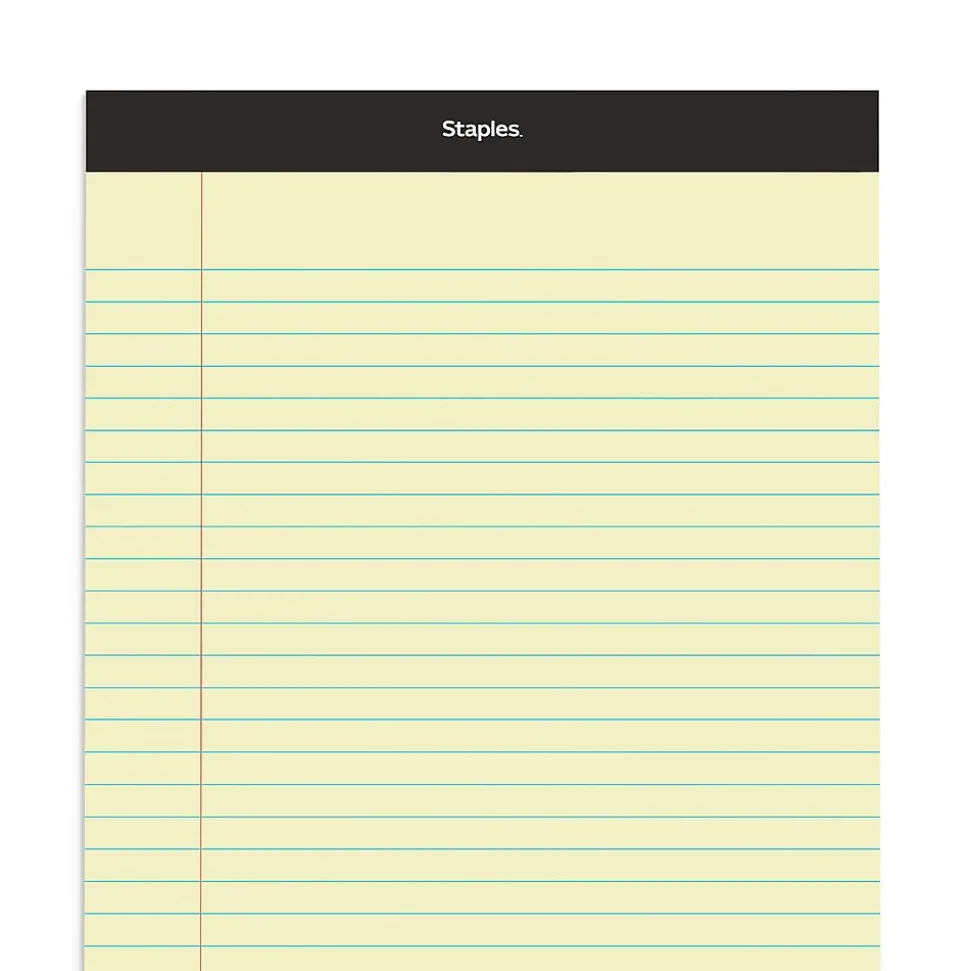 Stock your conference room or lecture hall with these canary wide ruled 50-sheet notepads. The perforations let you cleanly tear off a page, while the wide ruling helps keep your writing neat. These legal-size Staples 8.5 x 14-inch canary wide ruled notepads have a top-bound design so you can quickly rifle through the sheets and find information.