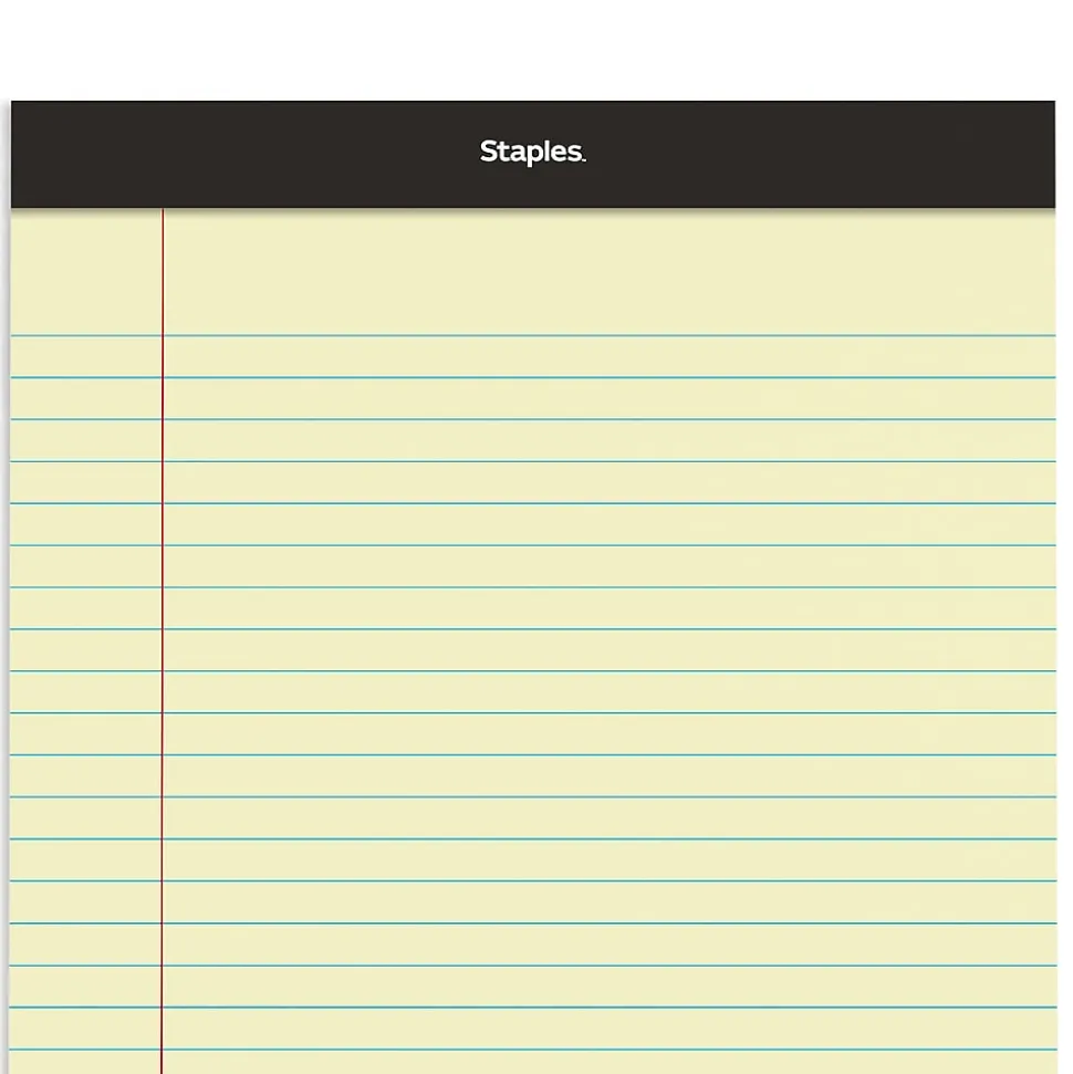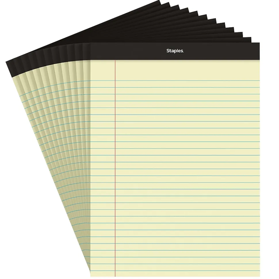 Fill the office supply cabinet with these canary 50-sheet notepads. The wide ruling helps keep your writing neat and easy to read, while the convenient perforations let you tear off a page to share. These Staples 8.5 x 11.75-inch canary wide ruled notepads are bound at the top so you can flip through the pages and find information easily.