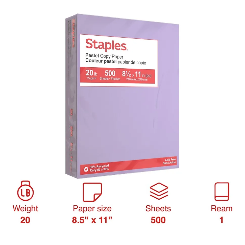 Create high-quality flyers, charts and other long-lasting documents with this 30% postconsumer recycled Staples letter-size pastel lilac colored copy paper. The 20-pound construction gives each sheet a sturdy feel, and it’s acid-free, making the paper a safe choice for long-term archival projects. This Staples pastel lilac colored copy paper is letter size to work great with most printers, copiers and fax machines.