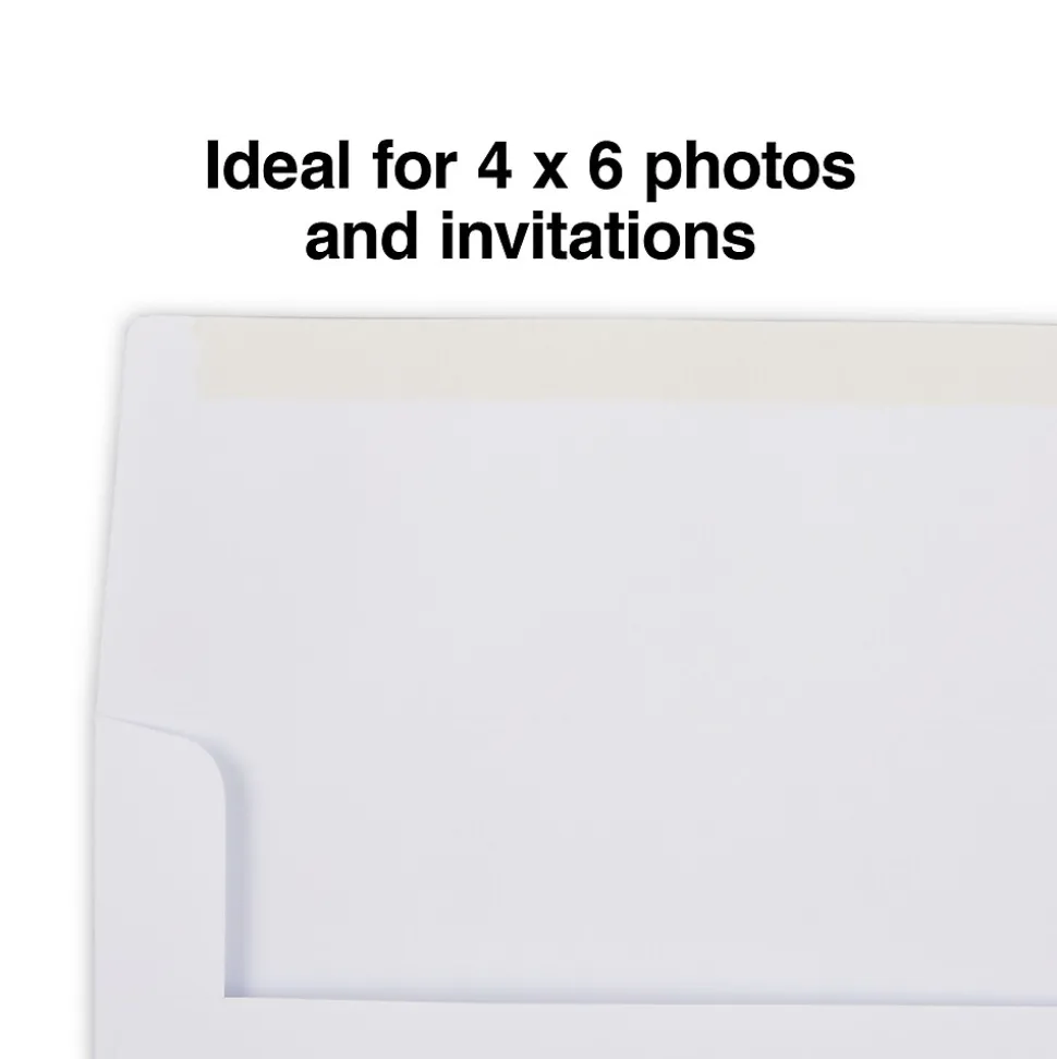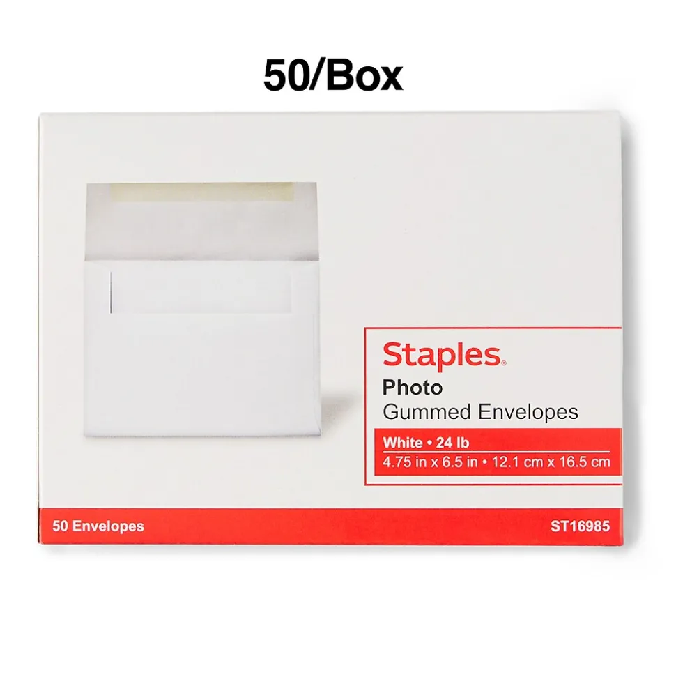 Keep important pictures stashed inside these white photo envelopes. The convenient size holds standard 4.75 x 6.5-inch photos, while the durable 24-pound paper weight prevents contents from bending. A crisp white color makes it easy to add a custom label or sticker, so you can quickly determine the items stored within each envelope. With 50 pieces in each box, these Staples photo envelopes provide a convenient way to keep your office stocked.
