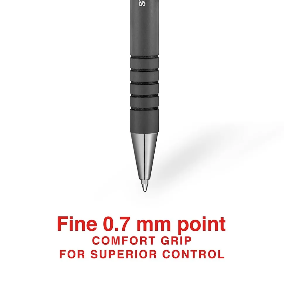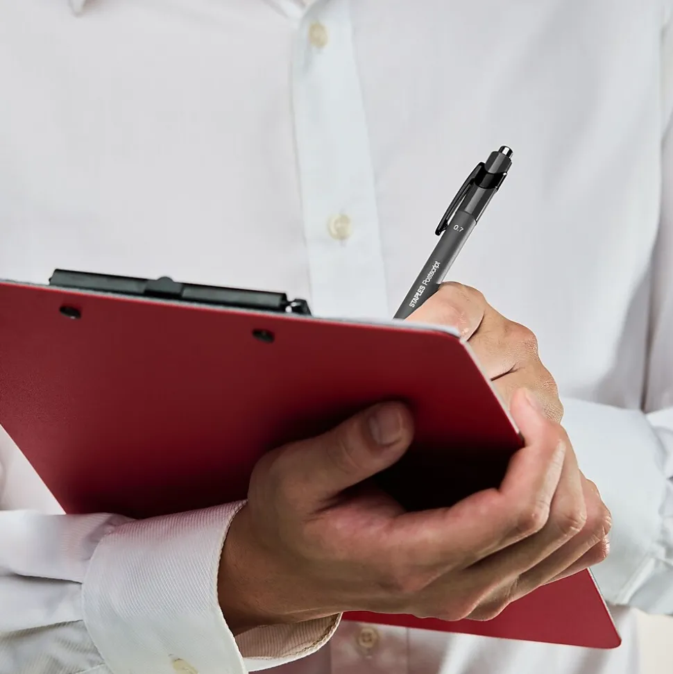 Ensure neat, readable writing with these Staples Postscript ballpoint pens. Smooth-touch barrels and ridged design offer added comfort, while the black ink glides across your paper. Each pen features a handy clip for storing in pockets or attaching to clipboards. The retractable design means there’s no caps to lose, making these Staples Postscript ballpoint pens ideal for use in reception areas, classrooms and waiting rooms.