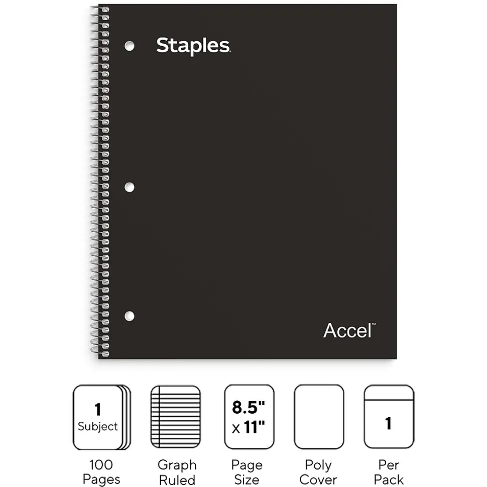 Arrange related data and drawings in this graph-ruled notebook. The polypropylene cover resists damage and keeps your notes safe, while the 100 sheets of graph-ruled paper provide ample room to draw diagrams and charts. This Staples Premium 8.5 x 11-inch black poly 1-subject notebook features perforated pages for clean removal, and the spiral-bound design offers full access to the interior.