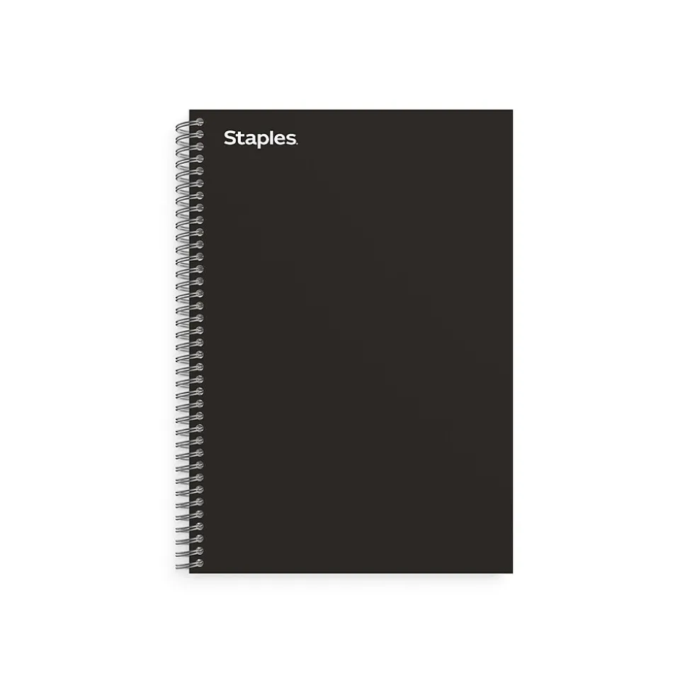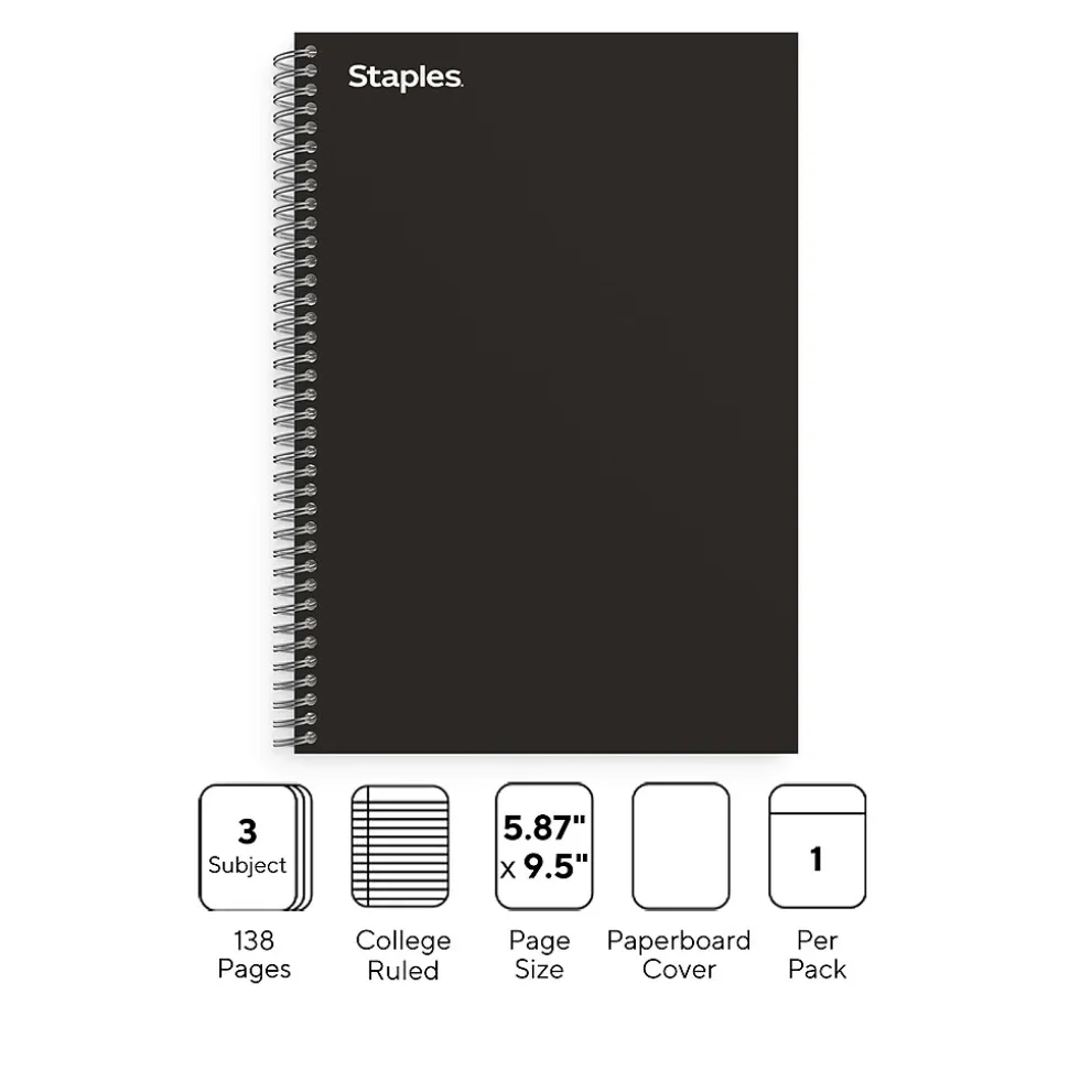 Expand your writing and note-taking solutions with this 138-sheet Staples Premium college-ruled notebook. Three pocket dividers let you classify and organize information, while the durable cover offers protection and reliability. Tear off a page easily with the handy perforations. This Staples Premium 5.88 x 9.5-inch black three-subject notebook features twin-wire binding that holds up to daily use and lets you leaf through the pages quickly.