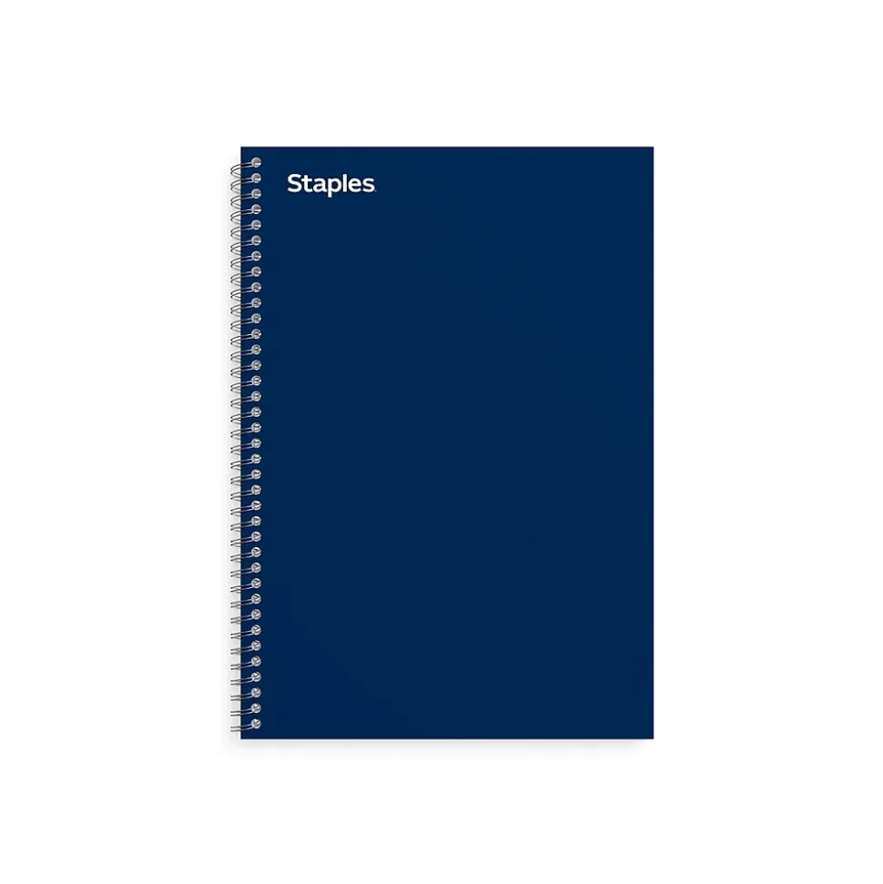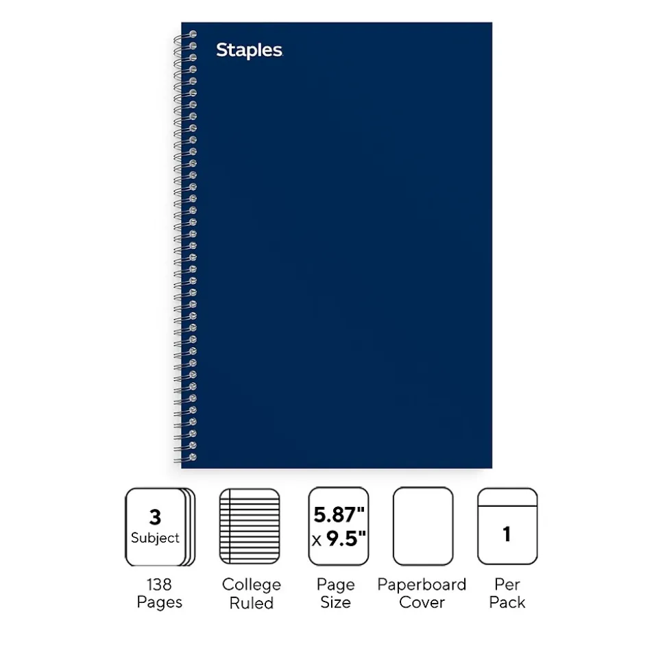 Keep a backup on hand with this 3-subject notebook. The college-ruled design ensures efficient space utilization and neat note-taking, while the twin-wire spiral spine offers easy access to the sheets inside, simplifying usage. Featuring a perforated edge, this Staples Premium 5.88 x 9.5-inch blue 3-subject notebook lets you remove the pages cleanly.