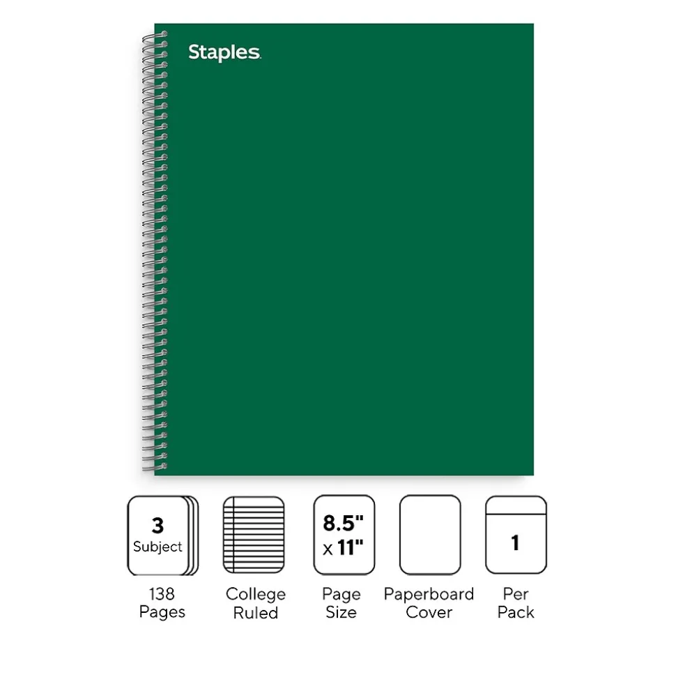 Categorize to-do lists with this 3-subject notebook. The twin-wire spiral spine design simplifies access to the sheets and supports easy page flipping, while the sturdy cover stands up to heavy use. This Staples Premium 8.5 x 11-inch green 3-subject notebook has perforated pages for clean removal to share with others, and the three pocket dividers keep your cards and loose paperwork organized.