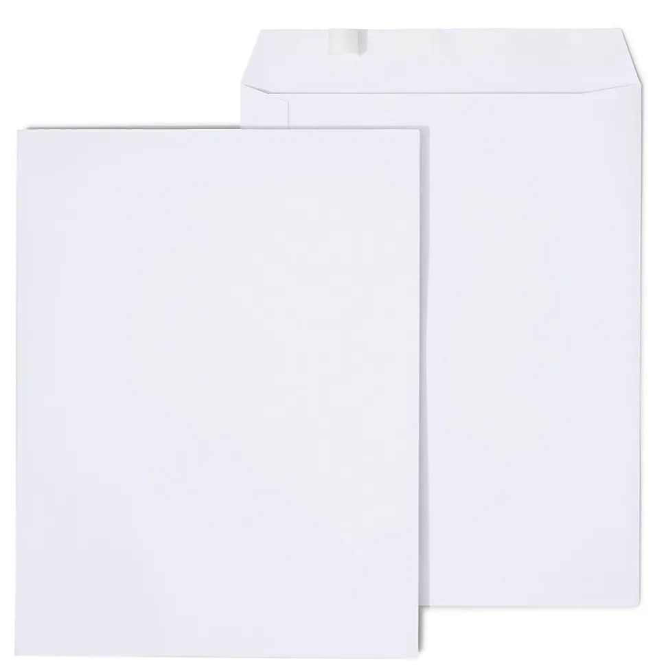 Send promotional material, financial reports and brochures with this 100-count box of Staples catalog envelopes. The EasyClose flap lets you seal envelopes quickly via peel-and-stick adhesive without water or sponges, and the bright white color helps addresses stand out. The woven 28-pound material of these Staples catalog envelopes protects delicate items and paperwork during transit and handling.