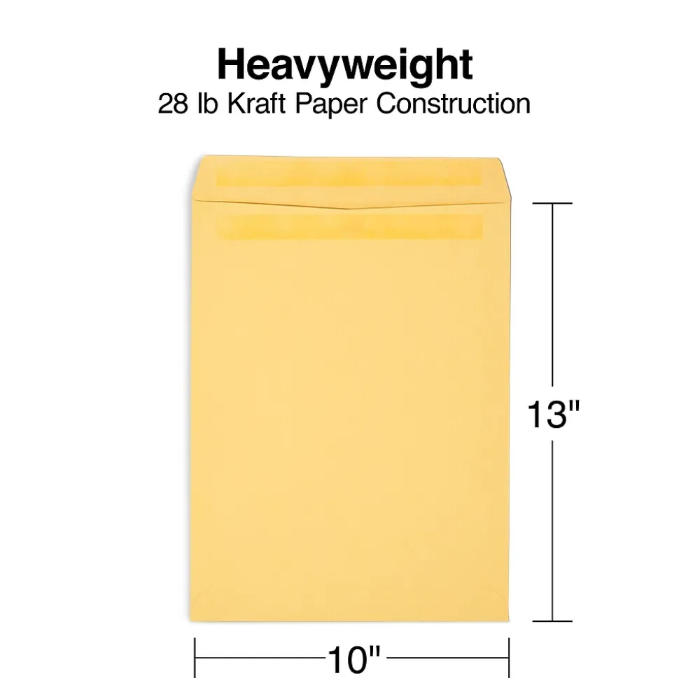 Send literature safely with these brown kraft catalog envelopes. Each one features self-sealing adhesive strips, so it’s easy to secure documents safely inside, while the 28-pound kraft paper construction helps resist tearing, moisture and the rigors of shipping. These Staples 10 x 13-inch self-sealing catalog envelopes are large enough to hold various large items without the need for folding.