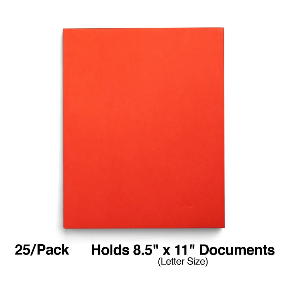 Organize documents by using these orange two pocket folders. Each folder is manufactured with economy-grade paper material to provide enhanced value, while the two pockets can hold up to 25 sheets of paper each without trouble for a total of 50 sheets. These Staples school two-pocket folders are available in several colors, making them ideal for color-coding documents for easy retrieval, and a business card holder lets you add professional personalization.