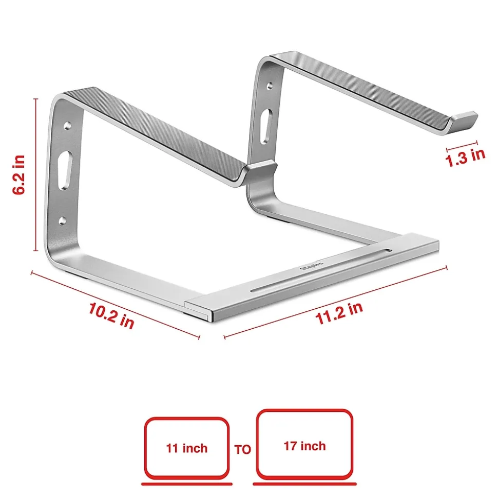 Set up an ergonomic work space with the Staples TECH Laptop Stand in silver. Elevates your laptop to eye level, promoting better posture, reducing eyestrain, and increasing your productivity. Constructed from sand-blasted aluminum, it’s lightweight and portable while still being durable enough for everyday use. This laptop stand fits laptops ranging from 11 to 17 inches and up to 11 lbs. The ventilated body lets your laptop cool by allowing air to continually circulate around your equipment. Rubberized anti-slip pads ensure stable placement on any surface, and the stand’s easy assembly makes it ideal for any user. Achieve a more ergonomic workspace with the Staples TECH Laptop Stand. Backed by Staples 100% Satisfaction Money Back Guarantee.