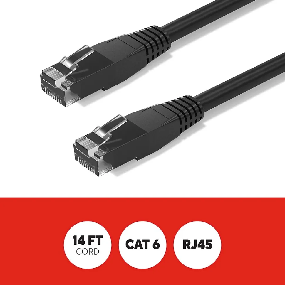 Connect high-speed network devices – like modems, PCs, laptops, smart TVs, gaming consoles and more – with this Staples TECH Ethernet cable. The 14-foot cable provides ample length to connect from across the room, while the CAT 6 configuration offers data transfer speeds up to 10Gbps for fast performance. This Staples TECH CAT 6 Ethernet cable has snag-free RJ45 connectors for an efficient and stable signal between compatible devices. Backed by Staples Brands 100% satisfaction guarantee, or your money back.