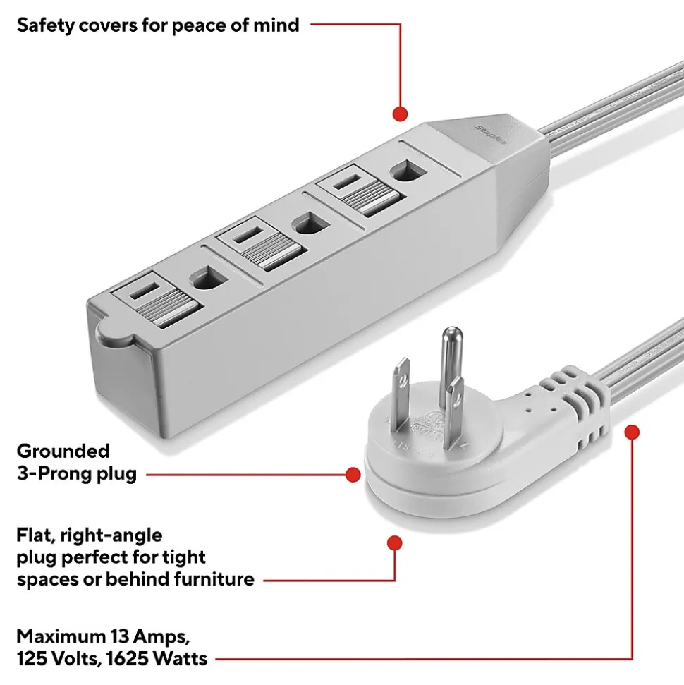 Stay powered up and plugged in with our 3-outlet power strip. The generous 15-foot cord lets you power items through out your workspace, no matter how forgotten the corner. Each outlet in the strip is grounded with a three-prong plug for safe connections, and plastic safety covers add an extra layer of protection to keep fingers and office accessories from plunging in. This extension cord is designed for indoor use, in dry areas. This extension cord is equipped with two cords and a flat, right-angle plug, making it easy to use in tight spaces or behind sofas or bookshelves. With a maximum capacity of 13 Amps, 125 Volts, and 1625 Watts, it’s made for lighter-duty jobs like powering light fixtures or lamps. Its sturdy 16-gauge construction combines flexibility and durability, so you get reliable power when you need it.