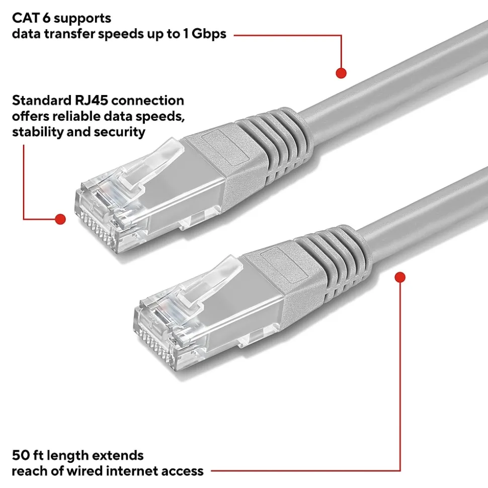 Connect high-speed network devices – like modems, PCs, laptops, smart TVs, gaming consoles and more – with this Staples TECH Ethernet cable. The 50-foot cable provides extra length to connect from across the room, while the CAT 6 configuration offers data transfer speeds up to 10Gbps for fast performance. This Staples TECH CAT 6 Ethernet cable has snag-free RJ45 connectors for an efficient and stable signal between compatible devices. Backed by Staples Brands 100% satisfaction guarantee, or your money back.