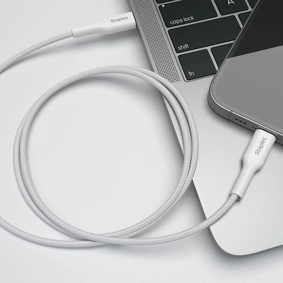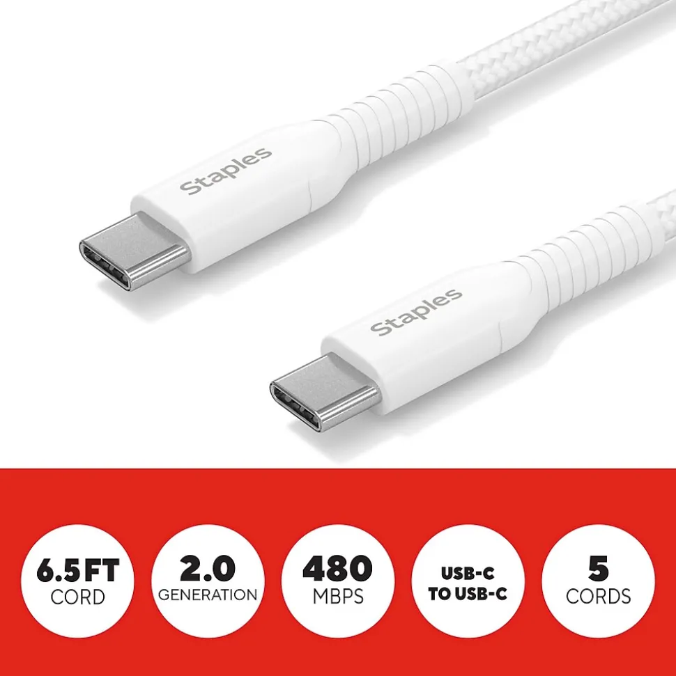 Staples TECH USB-C to USB-C Charging Cable, 6.5 ft., White, 5/Pack (ST62315)