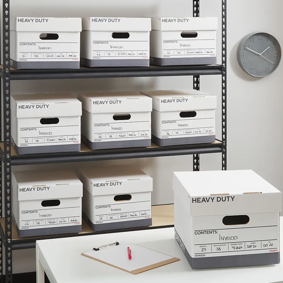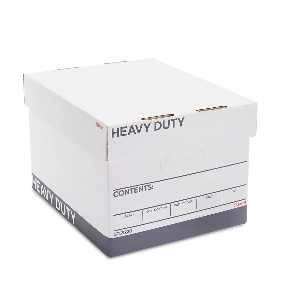 Maintain a clutter-free office space with these storage boxes. The easy-grip handles make carrying simple, while the lift-off lid helps keep stored letter-size and legal-size documents secure. With a 1500-pound stacking strength, the boxes support piling for an optimized work area. These Staples heavy-duty corrugated storage boxes are easy to set up for hassle-free filing and have preprinted write-in areas for effortless identification.