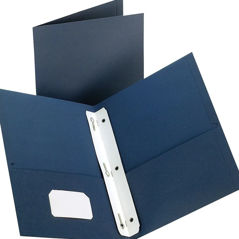 The 2 pocket folder is designed to hold loose documents securely. This dark blue folder features fasteners and has a die-cut business card slot for convenient contact information storage.