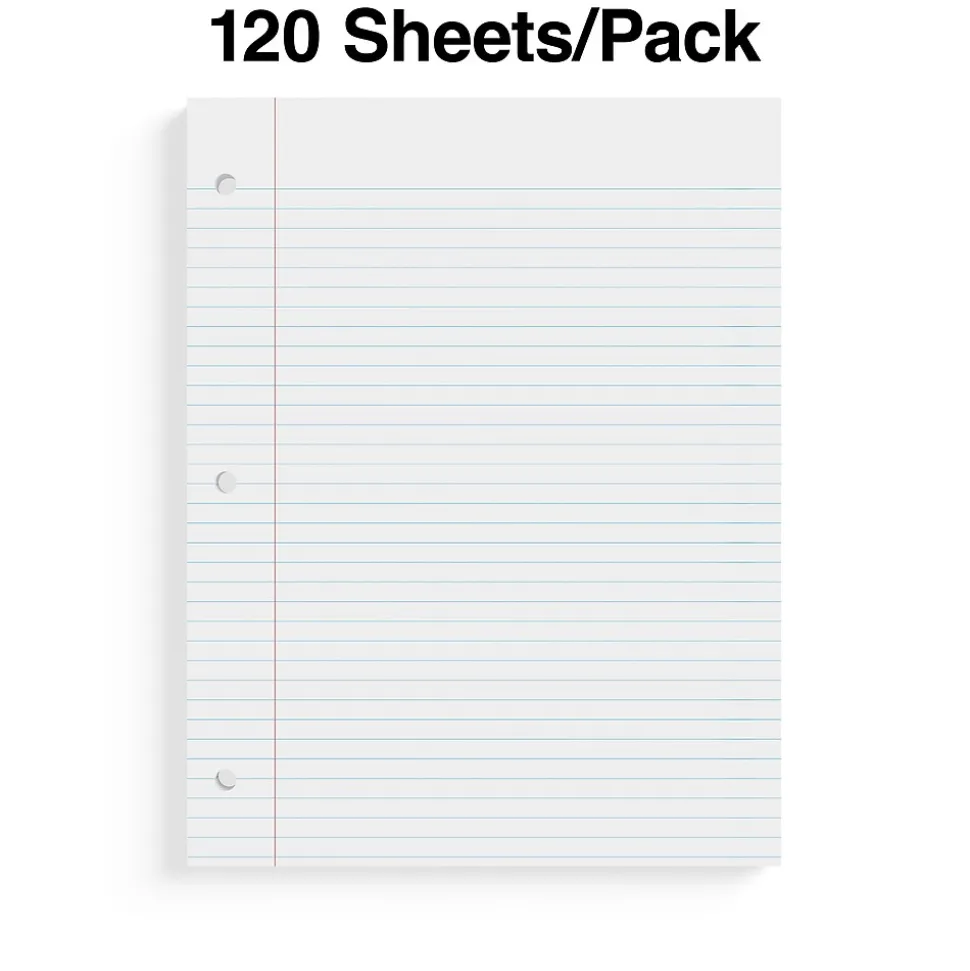 Stock your paper supplies with this wide ruled filler paper. The sturdy construction is ideal for everyday use, and each sheet is three-hole punched to fit into standard binders. This Staples Business Essentials 8 x 10.5-inch wide ruled filler paper comes with 120 sheets per pack, ensuring you have paper ready to use at appointments, class and other important meetings.