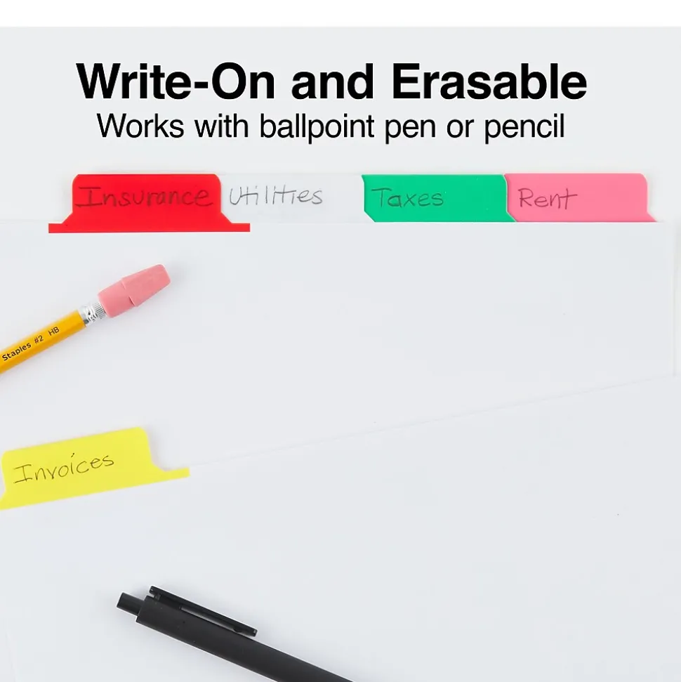 Get thick stacks of documents in order by using these five-tab assorted-color write-on dividers. Each one boasts a reinforced edge that helps prevent tearing at the binder holes, and the five tabs are erasable, letting you reuse them as often as needed. These Staples Write-On large tab dividers have five colors, so you can identify sections with ease.