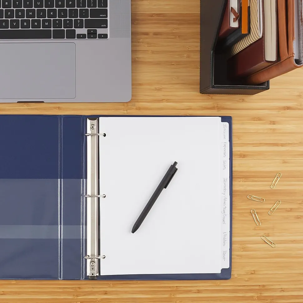 Get binders organized with these Staples eight-tab write-on dividers. Each divider has clear, reinforced hole edges to help prevent them from ripping out, while the laminated tabs let you write on them with just about any writing instrument. These Staples eight-tab write-on dividers provide ample amounts of space for labeling, and each tab can be erased and reused as often as needed.