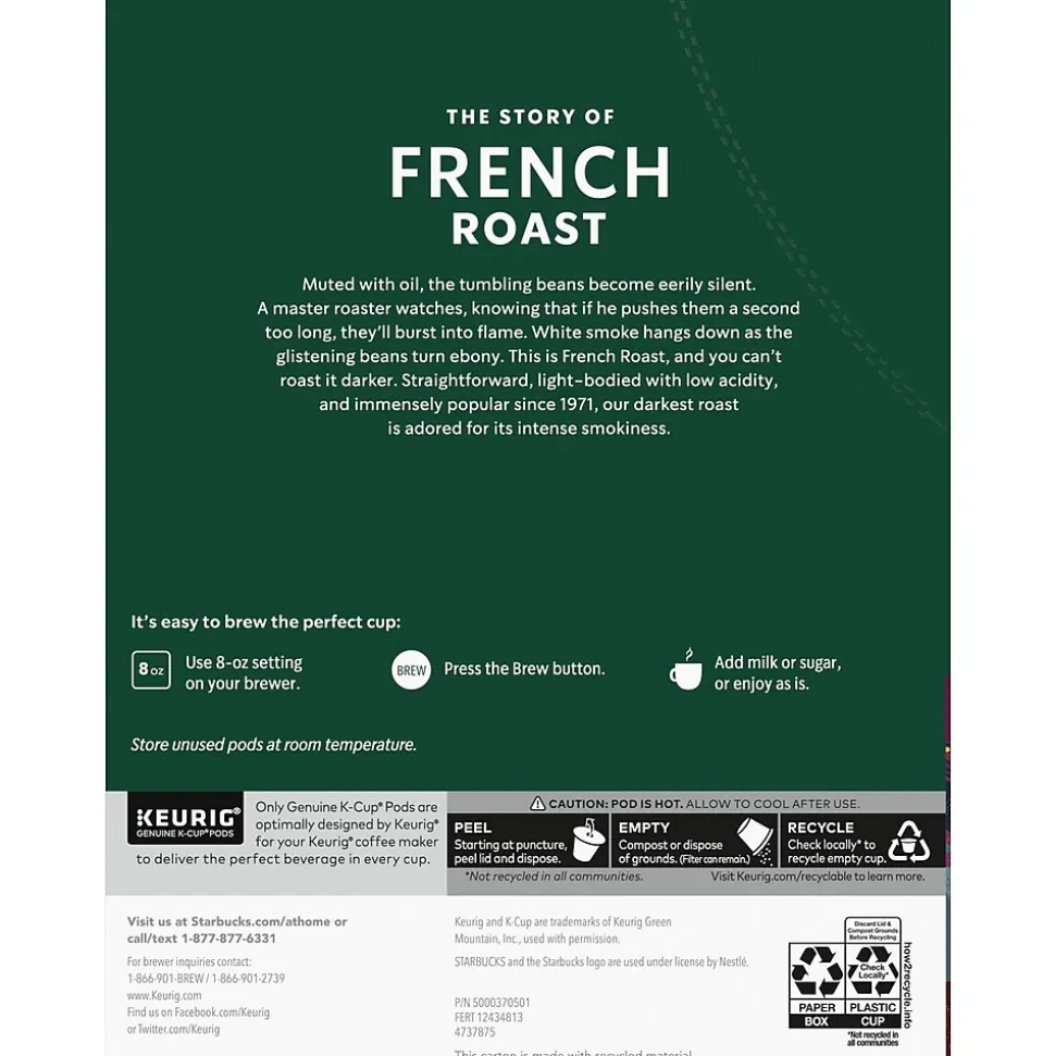 Keep a box of Keurig K-Cup Starbucks French Roast coffee in the break room and savor the smooth, rich dark, intense and smoky roast flavor. The 24 pods in this Keurig K-Cup Starbucks French Roast coffee let you serve the entire staff.