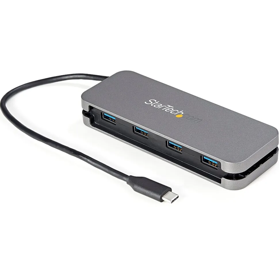 This 4 Port USB-C Hub enables you to connect four SuperSpeed USB 3.2 Gen 1 (5 Gbps) peripherals to your USB-C laptop or computer, an ideal solution for adding USB ports to a device that has limited USB ports available. It features a wrap-around cable manager, allowing you to tuck away the built-in cable for easy portability. With this USB-C hub you can connect four USB-A devices to a single USB-C port on your USB-C host device. The USB Type-C hub shares up to 15W (5V/3A) of power between connected devices, making it an ideal solution for connecting SSD/thumb drives, data storage, keyboards, mice, web cams and USB headsets. The USB hub is backward compatible with USB 2.0 (480 Mbps). Featuring a durable plastic housing that’s lightweight, and a sleek warp-around cable management system, this USB hub is the perfect travel companion for your laptop. Its small footprint ensures it will store easily in your laptop bag, and the wrap-around cable manager prevents tangles, ensuring easy accessibility. The USB hub is bus powered so there’s no bulky external power adapter. The USB hub is OS independent ensuring support on a wide range of platforms including Windows, macOS, Linux, iPadOS, Chrome OS and Android. The built-in host cable is 11 in. (28 cm) long, providing enough length to easily integrate into any workstation, reaching your host device even when it’s placed on a laptop riser or stand. The USB-C host connection works with any USB-C or Thunderbolt 3 laptop, tablet, smartphone or 2-in-1, such as Surface Pro 7, Surface Book, iPad Pro, MacBook/MacBook Pro/MacBook Air, XPS or X1 Carbon. HB30CM4AB is backed by a StarTech.com 2-year warranty and free lifetime 24/5 multi-lingual North American based technical support. StarTech.com has been the IT professionals’ choice for over 30 years.