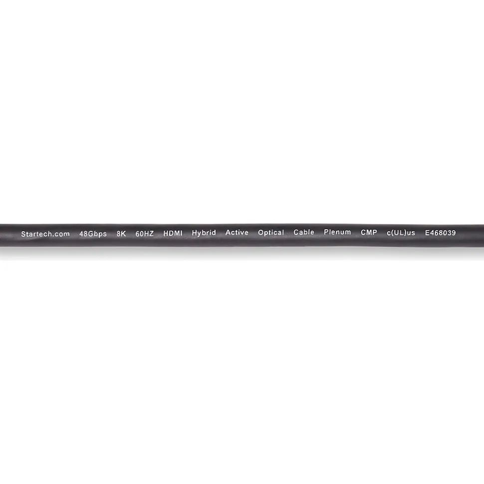 Route this ultra high-speed HDMI 2.1 hybrid active optical cable (AOC) through office plenum spaces for long-distance transmission of 8K 60Hz video and high-quality audio. The HDMI 2.1 AOC incorporates a hybrid construction consisting of fiber optic cores and copper conductors. This enables the offloading of low-bandwidth signals (EDID/HDCP/eARC) to maintain high-bandwidth transmission of 8K 60Hz video over fiber. The fiber optic inner cores and shielded copper conductors greatly reduce EMI for optimal signal quality across longer distances. This Plenum-Rated HDMI 2.1 cable features a CMP-rated cable jacket with low-smoke and flame characteristics. It is great for use in plenum spaces in buildings (e.g., ceilings and in-wall installations). The optical fiber core is reinforced with Aramid strands for tensile strength and is rated to withstand over 6000 bending cycles at 120 degrees. This protects the cable from damage when routing through tight spaces requiring multiple bends.