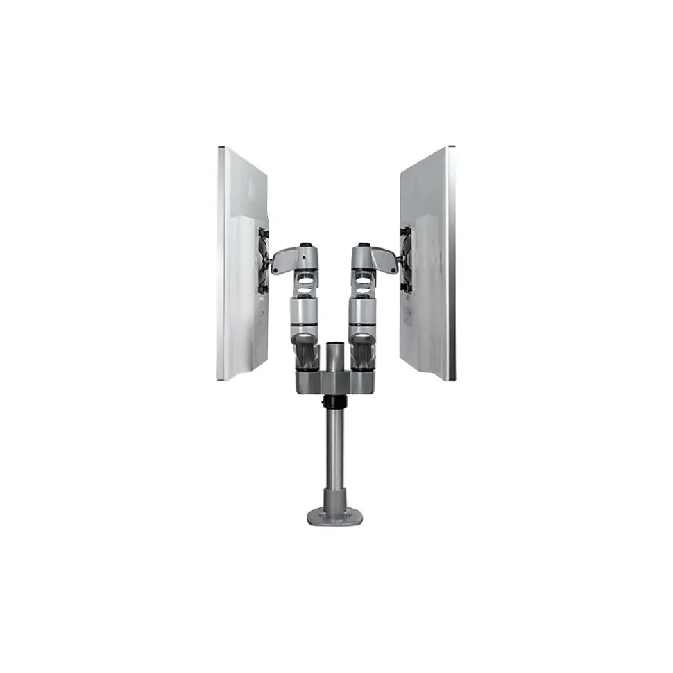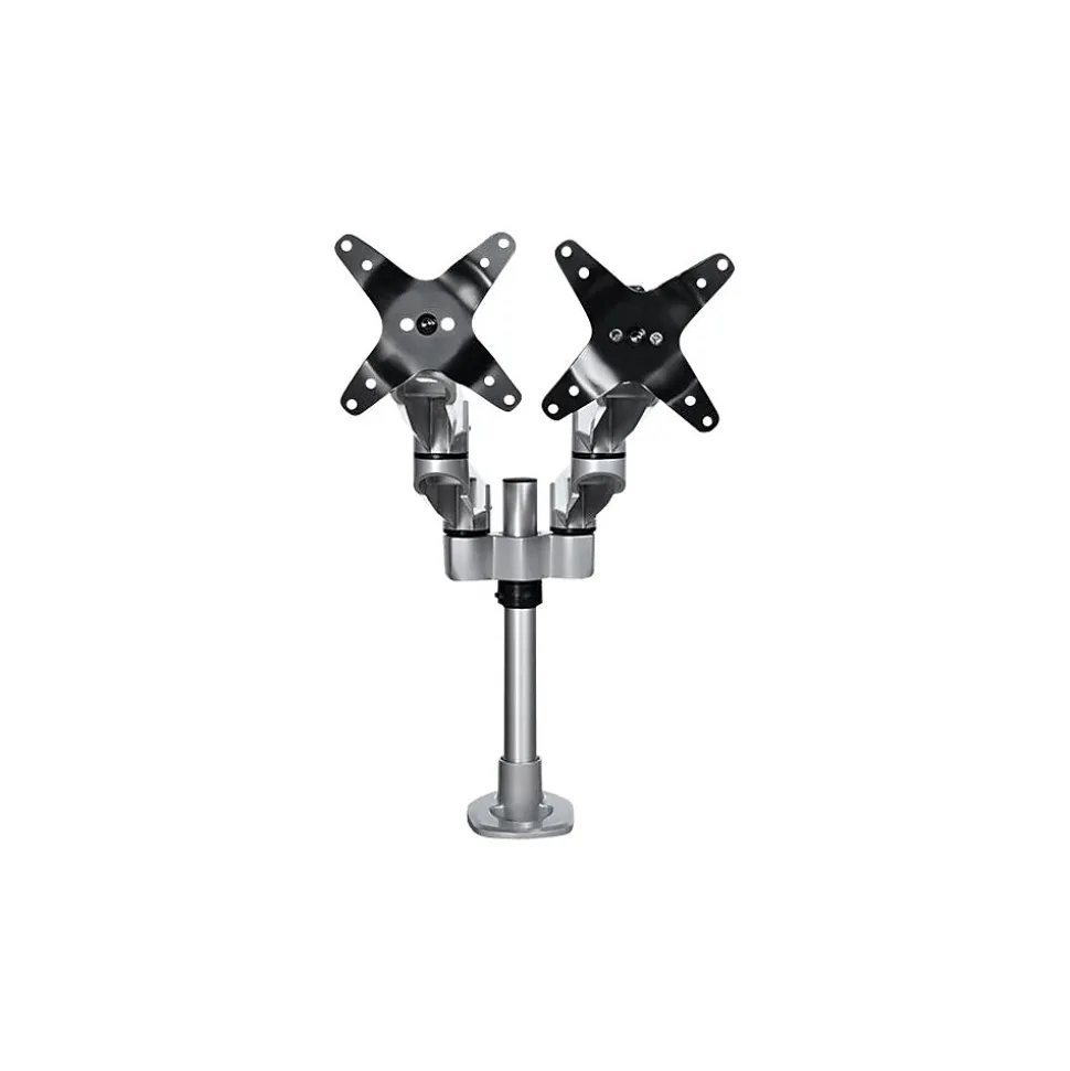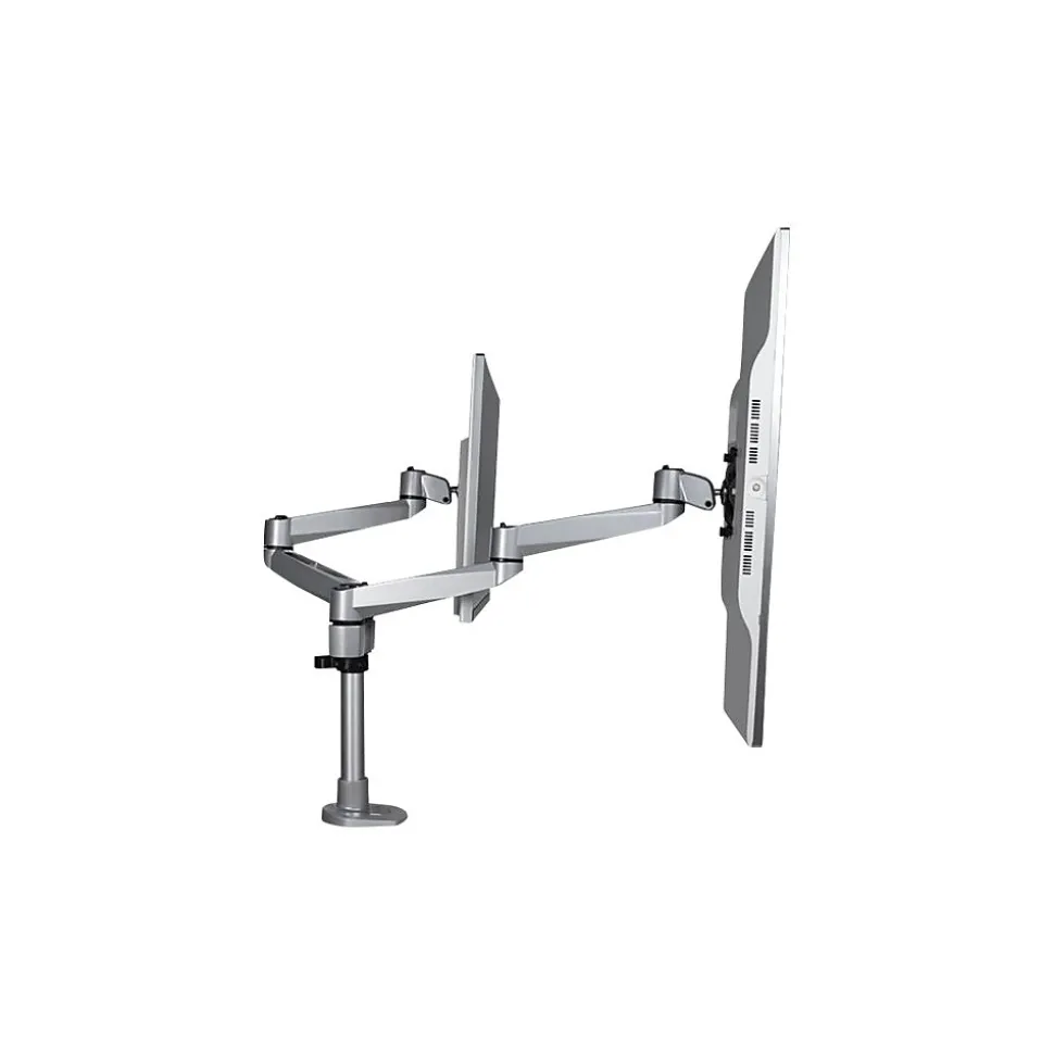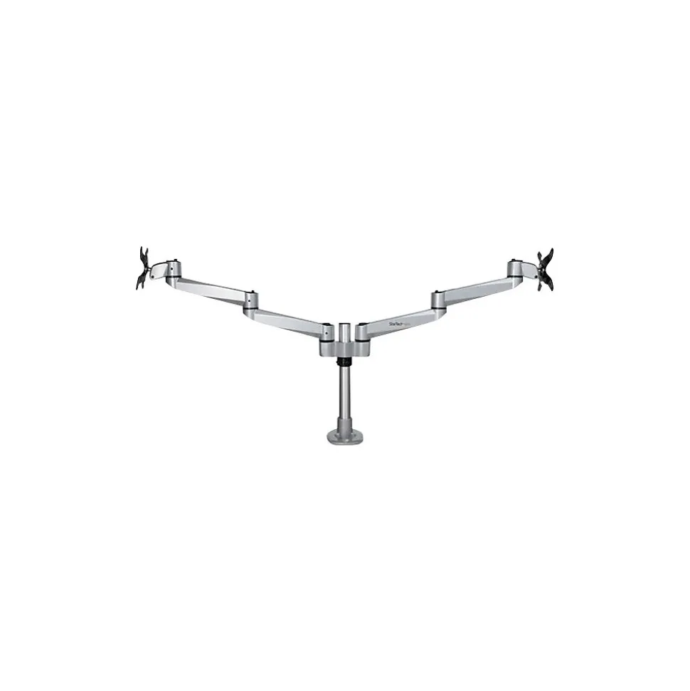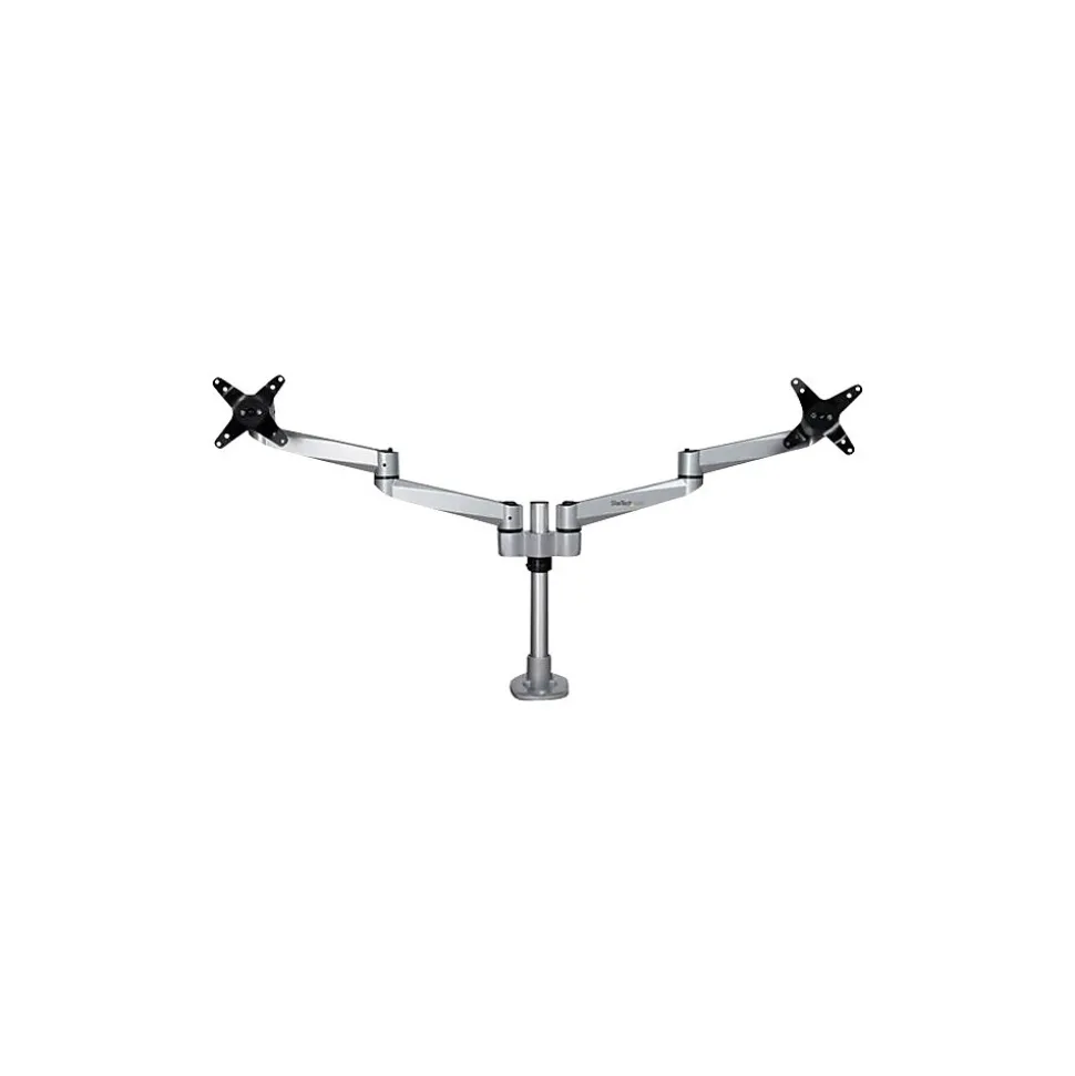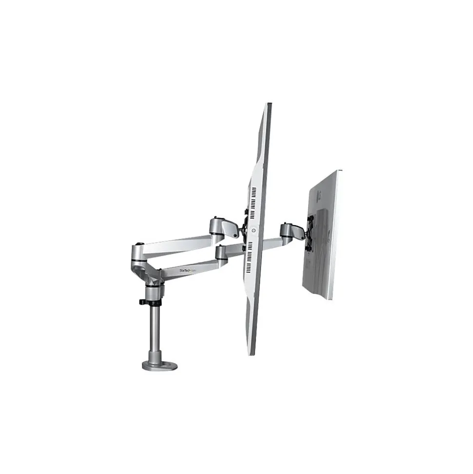 Monitor Mount Desk/Grommet Mount Tool-less Assembly For up to 27″ Monitors. Create an ergonomic workspace with this premium desk-mount dual monitor arm, for monitors up to 27″ each. The two articulating monitor arms with dual-swivel action offer a wide range of motion side to side. The attractive silver finish enhances the aesthetics of your workspace. Enjoy a Wide Range of Motion to Work in Comfort The dual articulating monitor arms offer a wide range of motion on several axes. It provides effortless motion to adjust the position of your monitors. Sleek and Stable Aluminum Design The robust aluminum design provides stable support for your monitors. The computer-monitor desk mount supports two VESA mount monitors (75×75, 100×100) with a weight capacity of up to 22 lb. (10 kg) per display. The cable-management channel helps to keep your workstation neat and tidy. Adjust your Viewing Angle Share your screen with ease. The double monitor mount offers a full +180-degree / -180-degree pan, to move your screen left or right. It tilts freely +90 / -15 degrees to adjust the angle up or down. Rotate your screens for landscape or portrait viewing. Height Adjustment Work in comfort. This height-adjustable monitor mount lets you raise or lower the monitor arms along the pole, with a range of up to 6.3″ (160 mm) Tool-less Assembly The fully assembled desk clamp and pole, plus quick slide-and-click connections, ensure easy assembly. It also saves time when setting up multiple units. The dual-screen mount gives you the option of desk clamp or grommet hole mounting (hardware included). The TAA compliant ARMDUALPS is backed by a StarTech.com 10-year warranty and free lifetime technical support.