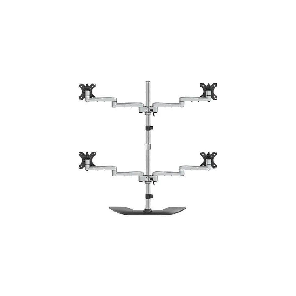 Four Monitor Mount Height Adjustable For Up to 32″ Monitors. Boost productivity and customize your workspace with this quad-monitor stand, suspending four monitors above your desk. Enjoy optimum viewing with four articulating monitor arms, providing a wide range of motion. The free-standing base gives you flexibility in placing your setup within your workspace. Designed for Productivity Constructed of aluminum and steel, the heavy-duty four-monitor stand lets you set up your workspace for optimum productivity. The monitor stand supports four VESA mount (75×75, 100×100) monitors up to 32″ each, with a maximum weight capacity of up to 17.6 lb./8 kg per display. Create a More Ergonomic Workspace Create a multi-monitor workstation that works best for you. Take advantage of four-screen efficiency for financial analysis, web coding, video editing or many other applications. Customize your setup by adjusting your display height, position and viewing angles for an ergonomic workspace. The swiveling arms provide maximum viewing flexibility. Height-Adjustable Monitor Mount Place your monitors at the ideal height. Simply adjust the display height along the 34″ (864 mm) pole. Align your monitors with the micro-adjustment feature. Enjoy Optimum Viewing The four-screen monitor stand lets you extend the articulating arms up to 16.6″ (42.2 cm) to position your monitors in the ideal position. Tilt your monitors +90/-40 degrees and swivel 360 degrees. Rotate your displays 360 degrees for portrait or landscape viewing. Keep Cables Out of View Neatly route your cables with the cable-management channels. ARMQUADSS is backed by a StarTech.com 5-year warranty and free lifetime technical support.