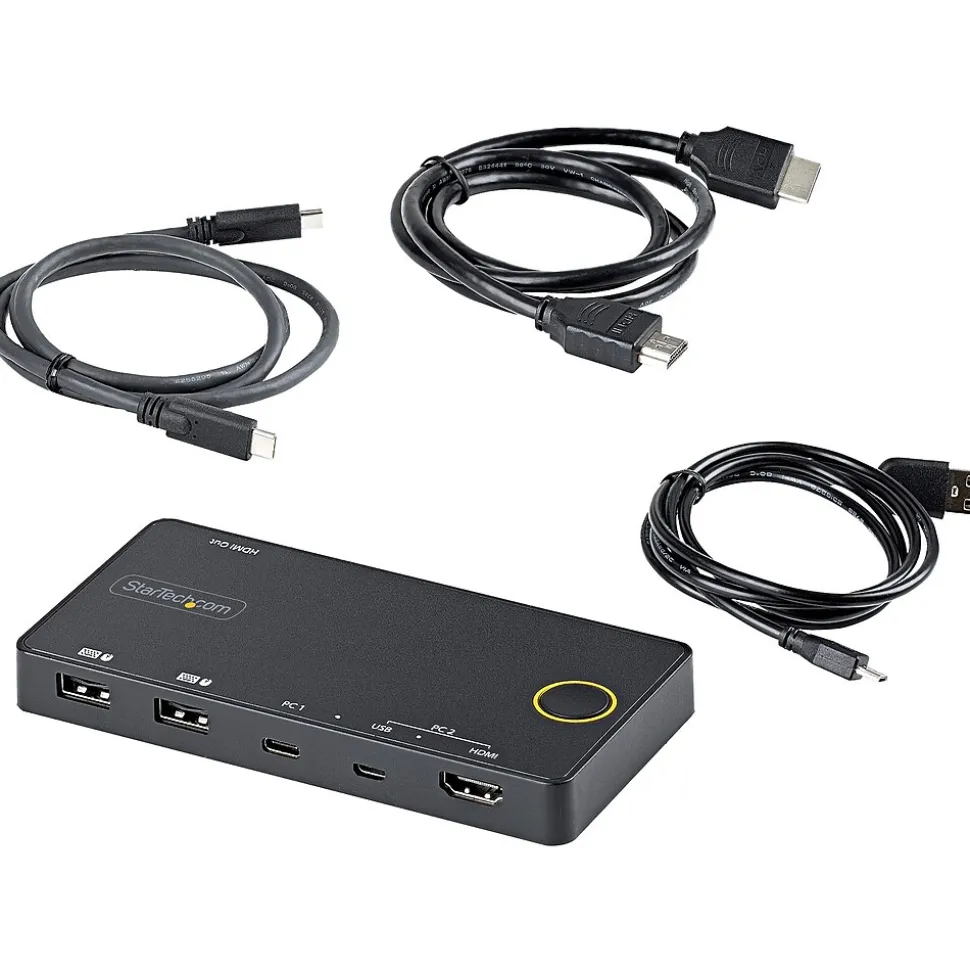 - Cables for host computers are included (USBC to USBC, USB-A to Micro USB-B and HDMI); the dual port KVM switch provides an easy to deploy solution straight out of the box; works w/ popular brands like Dell, HP, Apple iPad Pro/MacBook and Lenovo