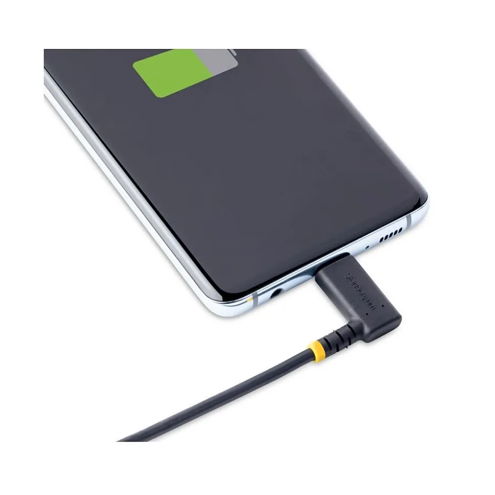 - Black 6in USB-C charging cable features right angle C connector that reduces strain on the port and allows cable to run flush with device