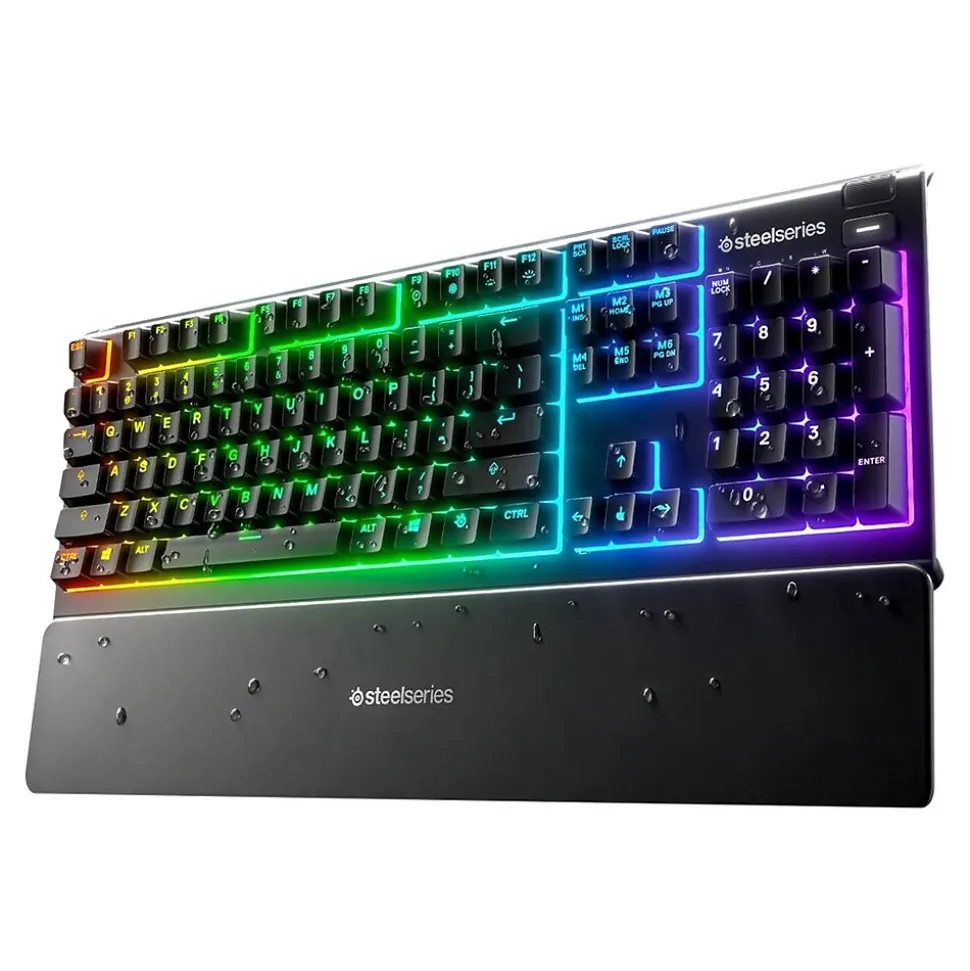 The Apex 3 gaming keyboard was built for the needs of gamers, with IP32 water resistance for protection against spills and accidents. Its whisper quiet gaming switches provide comfortable low friction performance for over 20 million keypresses. The keyboard includes 10-zone RGB customization, a premium magnetic wrist rest, dedicated multimedia controls, and gaming-grade anti-ghosting.