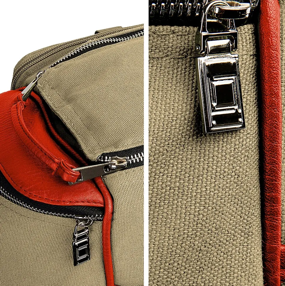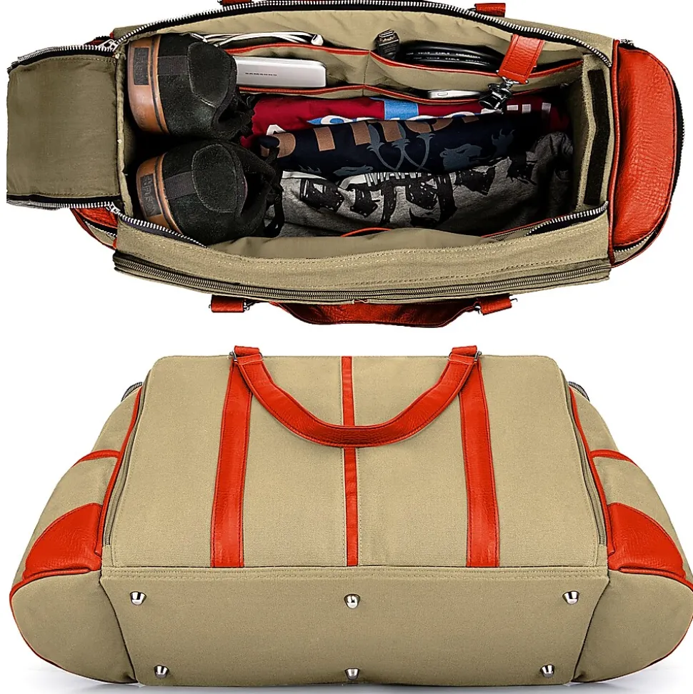 Crossbody Duffel Travel Bag, A Carry-on sized carry-all bag with a separate fold out 15.6″ laptop compartment, all made of water repellent canvas. The exterior front panel features a large slip pocket with a magnetic button closure. Attached over this are two patch pockets with large box pleats to help extend capacity and store accessories. The backside has a padded fold out laptop compartment. This compartment is flush against the rest of the design of the duffel, cleverly covert. Unzipping the top of this compartment allows access to pull out the laptop, but unzipping the entire zipper, allows the entire compartment to lay flat above a surface.