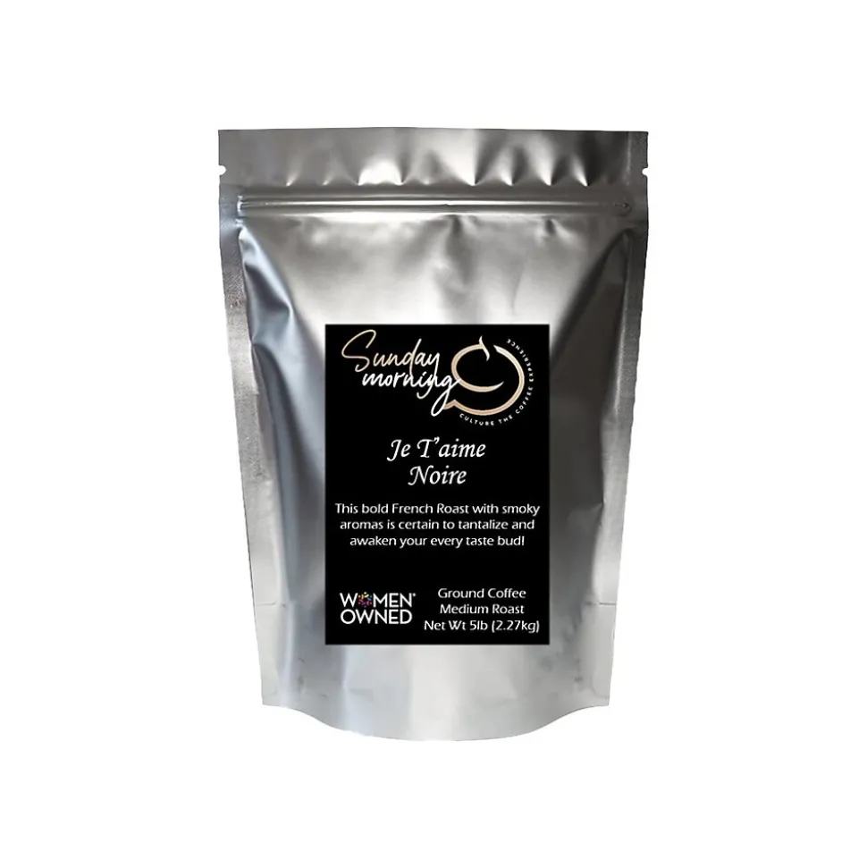 The Sunday Morning Coffee Je T’aime Noire robust coffee, named for a famous style of roasting in France, is deeply flavored with sweet notes that intermingle with smokiness. This French roast is certain to tantalize and awaken every taste bud.