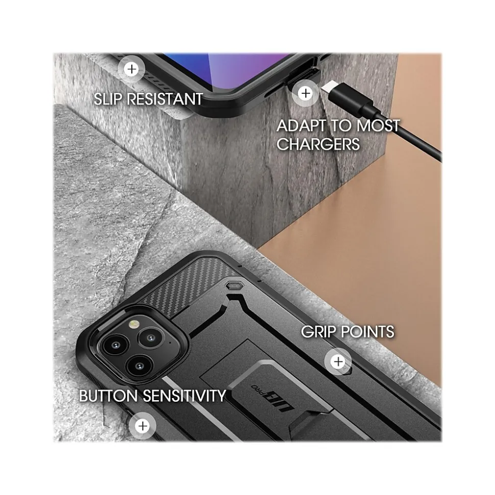 The iPhone 12 Pro Max Unicorn Beetle Pro rugged case is a winner of CNET’s annual drop test with the highest total feet. A full-body design includes a built-in screen protector. Made of shock-absorbing TPU and unbending polycarbonate. Wireless charging compatible. Includes a rotating belt clip holster.