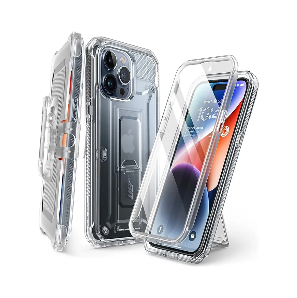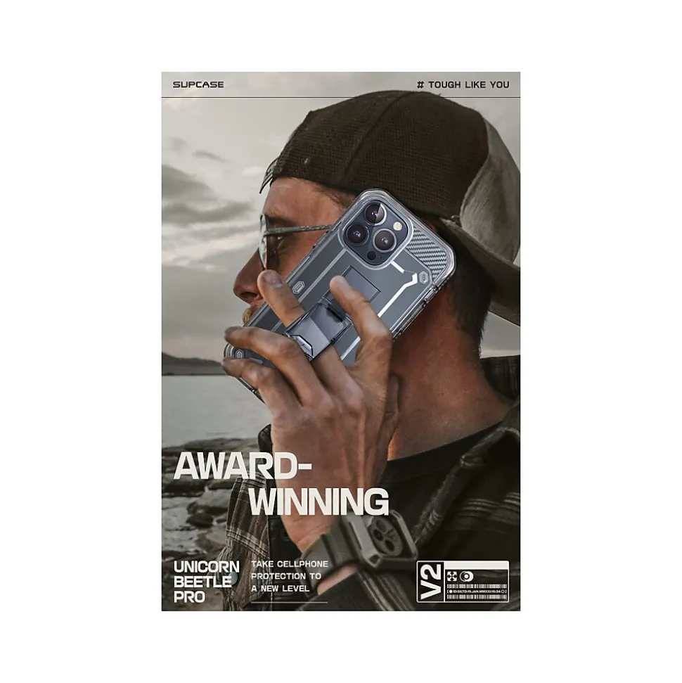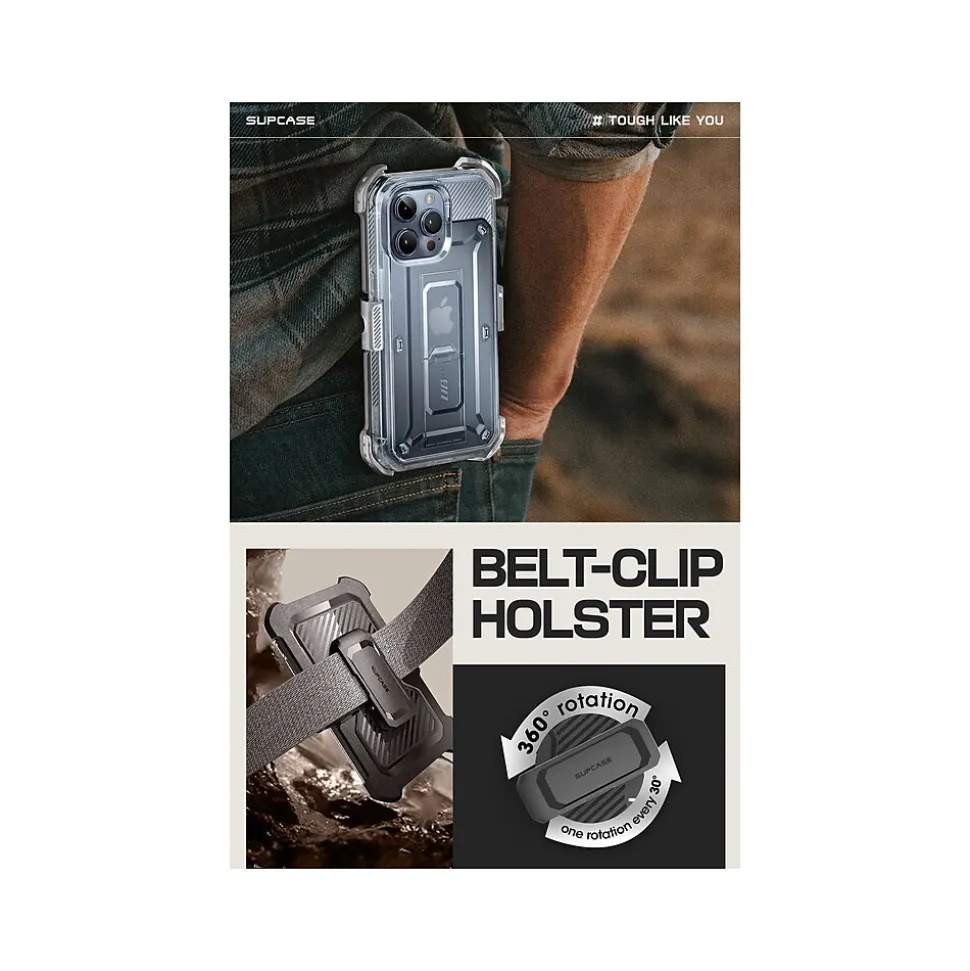 The SUPCASE Unicorn Beetle PRO rugged case ensures full-body protection for your iPhone 15 Pro Max (6.7″ screen). Features a dual-layer unbending polycarbonate back and impact-resistant TPU bumper. Port plugs keep out dust and debris.