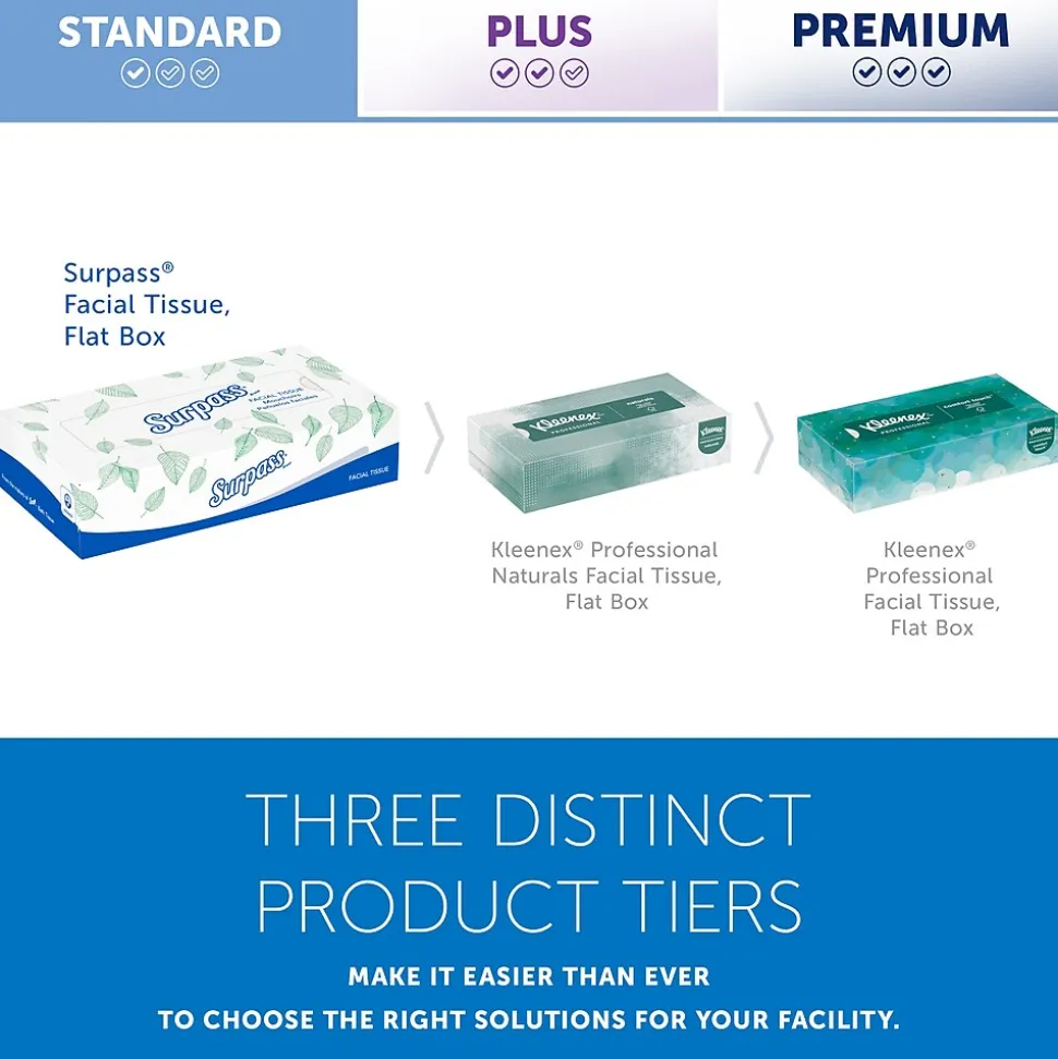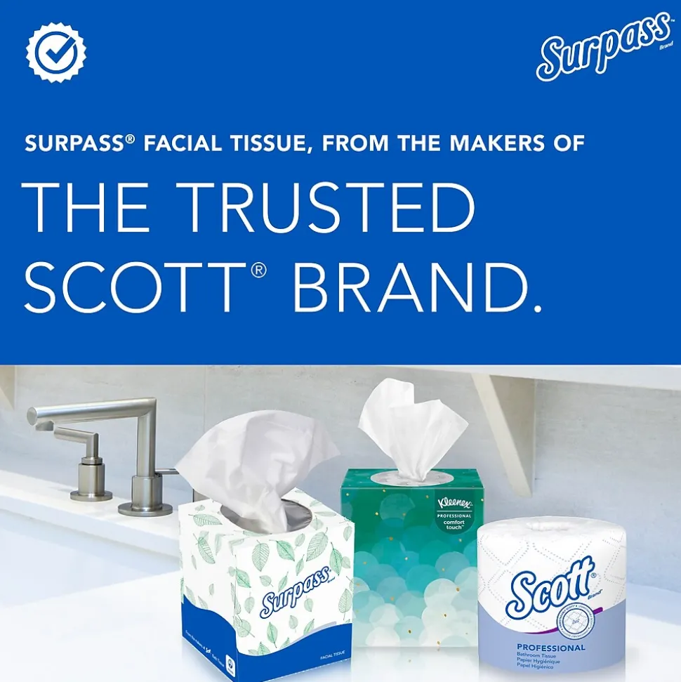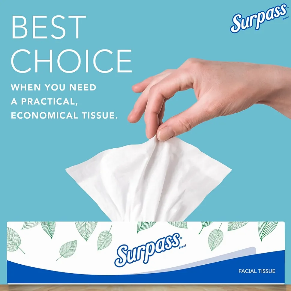 - 100 Tissues/Box, 30 Surpass® Facial Tissue Boxes/Case; 3,000 Tissues/Case; 2-Ply, White; Ecologo; Flat Facial Tissue Boxes for Business