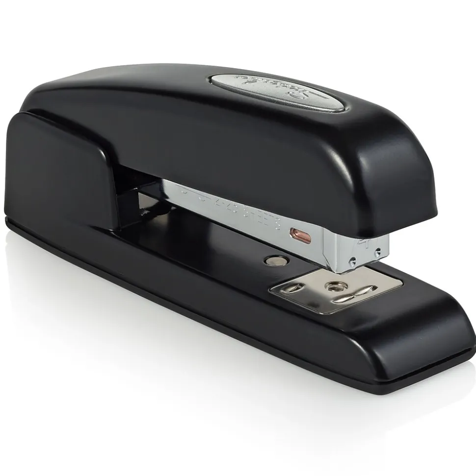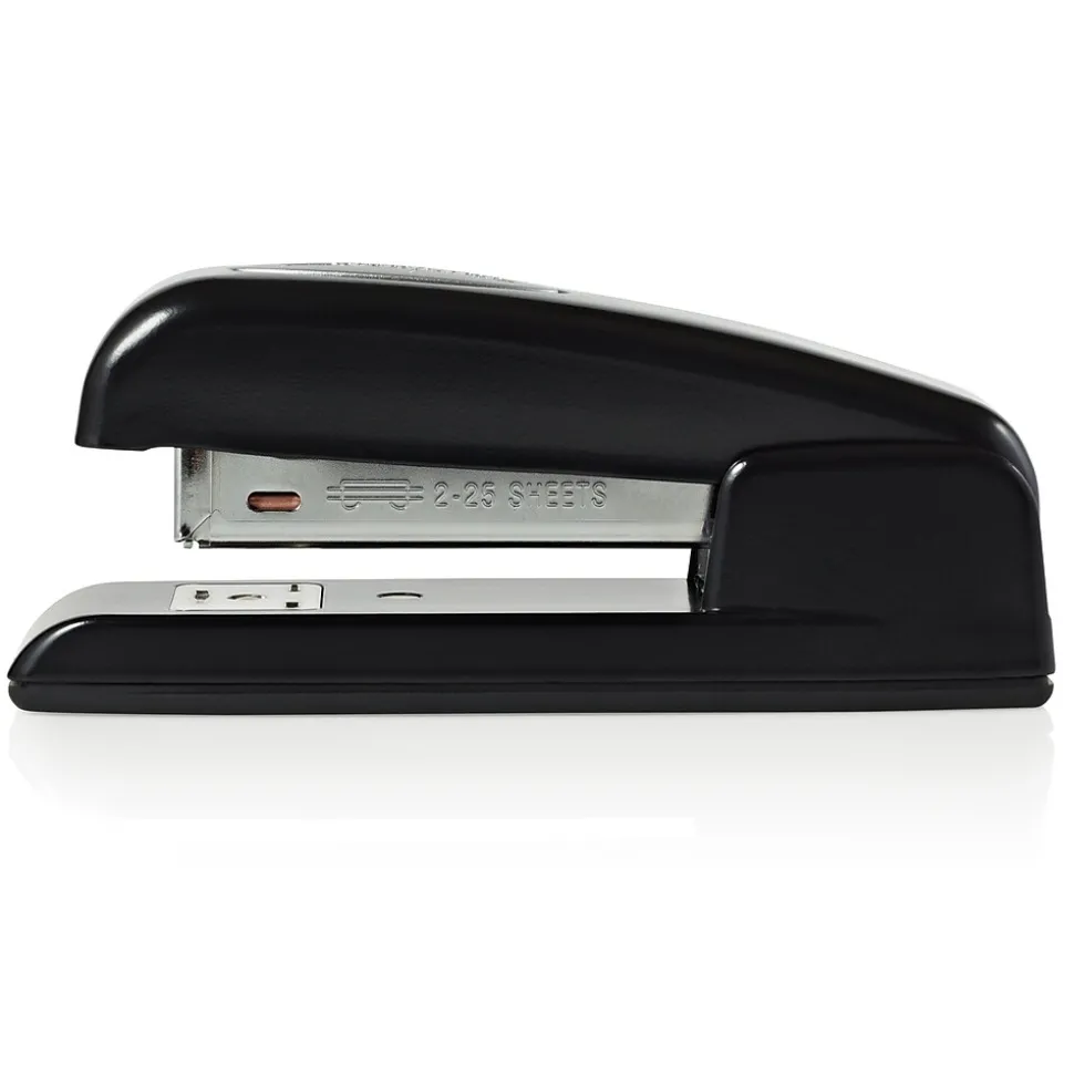 Keep papers organized by using this stapler. The smooth edges fit the hand naturally for comfortable use, and the inner railing helps prevent jamming, allowing for consistent operation. High strength allows up to 25 sheets of paper to be fastened at a time. This Swingline 747 business stapler can be opened for tacking up flyers and posters, and the all-metal die-cast base provides durability for standing up to daily wear.