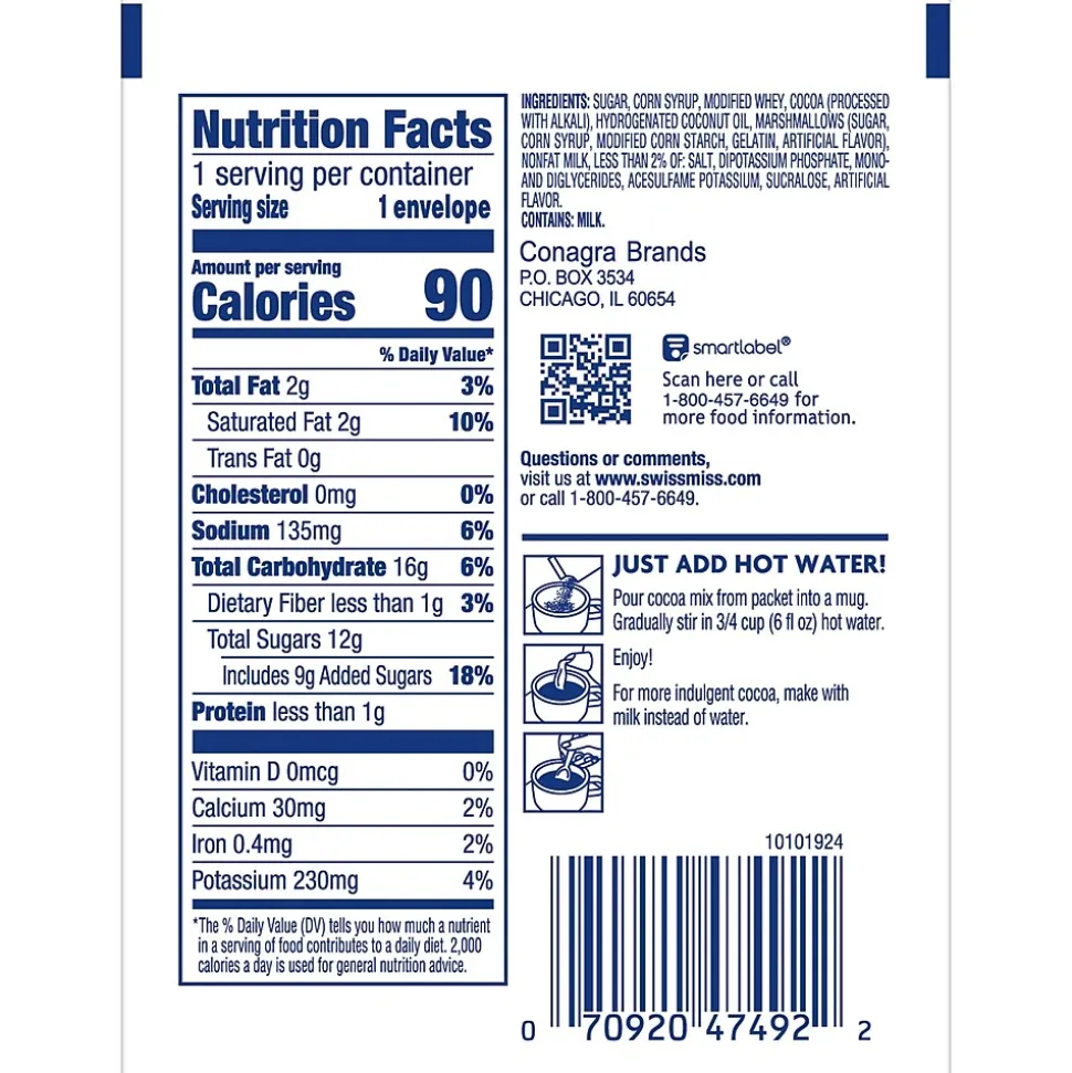 Supply delicious drinks for the reception area, staff room or other various spaces with these hot cocoa packets. Each one contains a delightful chocolaty mix and includes marshmallows, adding an extra layer of tastiness to your beverage. These Swiss Miss hot cocoa packets come with 50 to a box, making it easy to restock your supply.