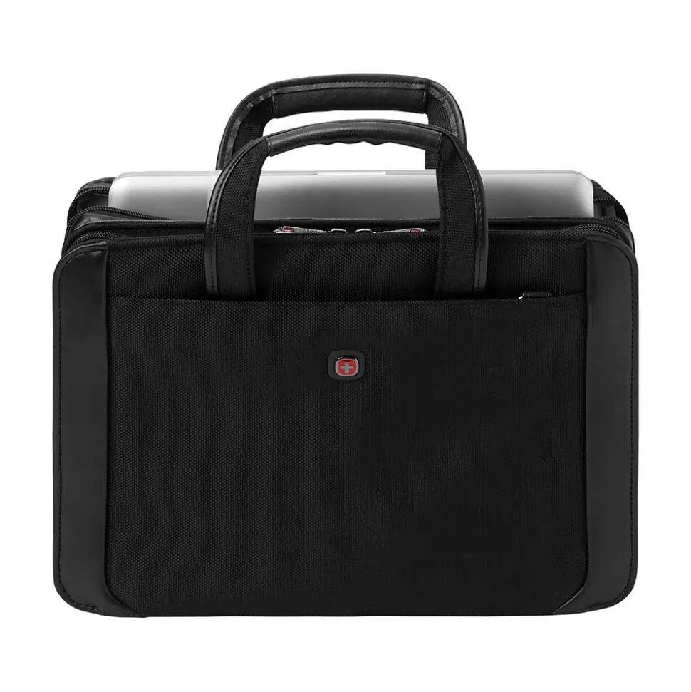 Bring a laptop, binder, and other important items on the go easily with this presentation padfolio. The included lined writing pad allows for convenient note-taking during meetings, while the adjustable shoulder strap and cushioned handles provide added comfort when walking between appointments. This Wenger Proxy 14-inch zippered laptop presentation padfolio has an exterior pocket, offering quick, simple storing of loose papers.